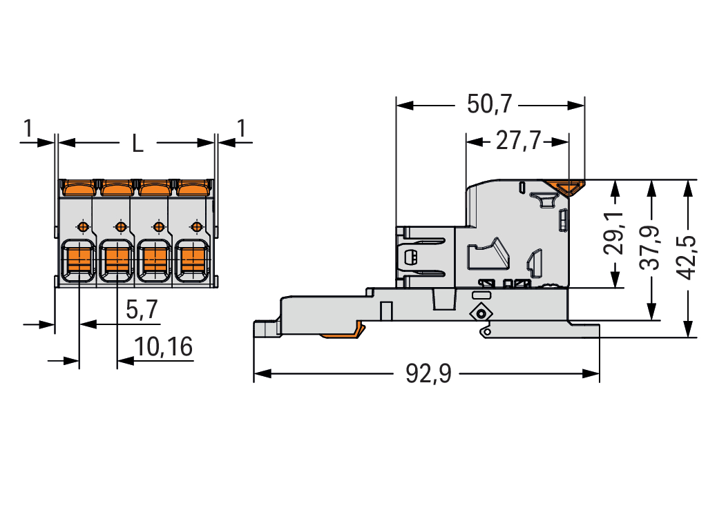 wtyk 1-przewodowy; dźwignia; Push-in CAGE CLAMP®; 16 mm²; raster 10,16 mm; 6-bieg.; 100% ochrona przed błędnym połączeniem; TS 35/montaż na płycie; zestyki posrebrzane; 16,00 mm²; jasnoszary
