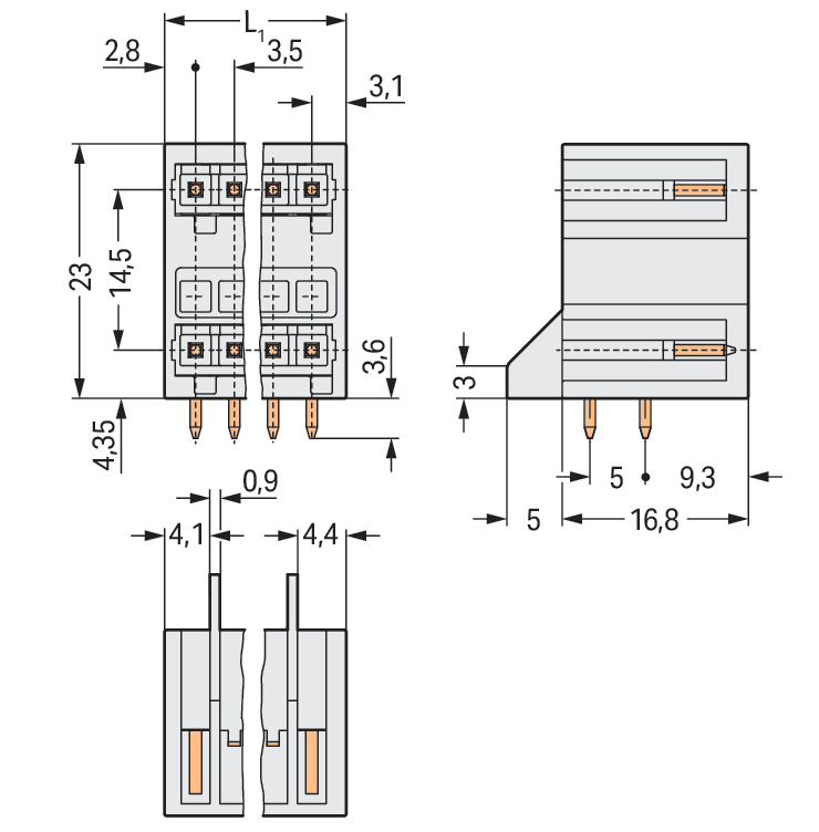 wtyk THT 2-piętrowy; pin lutowniczy 1,0 x 1,0 mm; konstrukcja kątowa; 100% ochrona przed błędnym połączeniem; raster 3,5 mm; 4-bieg.; jasnoszary