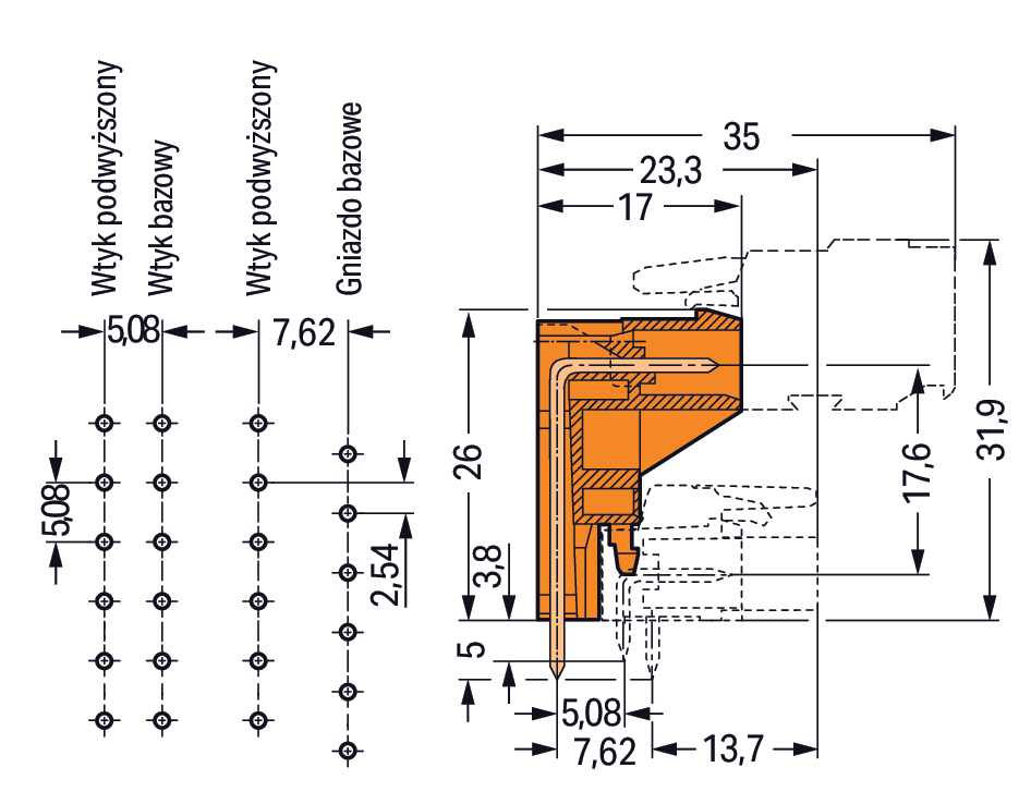 wtyk THT podwyższony; pin lutowniczy 1,0 x 1,0 mm; konstrukcja kątowa; raster 5,08 mm; 12-bieg.; pomarańczowy