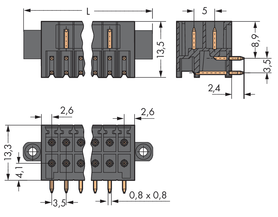 wtyk THR 2-rzędowy; pin lutowniczy 0,8 x 0,8 mm; konstrukcja kątowa; 100% ochrona przed błędnym połączeniem; gwintowy uchwyt montażowy; raster 3,5 mm; 20-bieg.; czarny