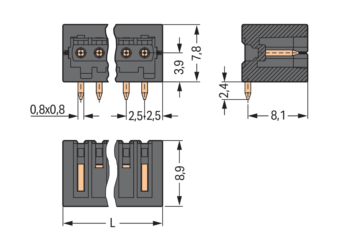 wtyk THR; pin lutowniczy 0,8 x 0,8 mm; konstrukcja kątowa; 100% ochrona przed błędnym połączeniem; raster 2,5 mm; 2-bieg.; czarny