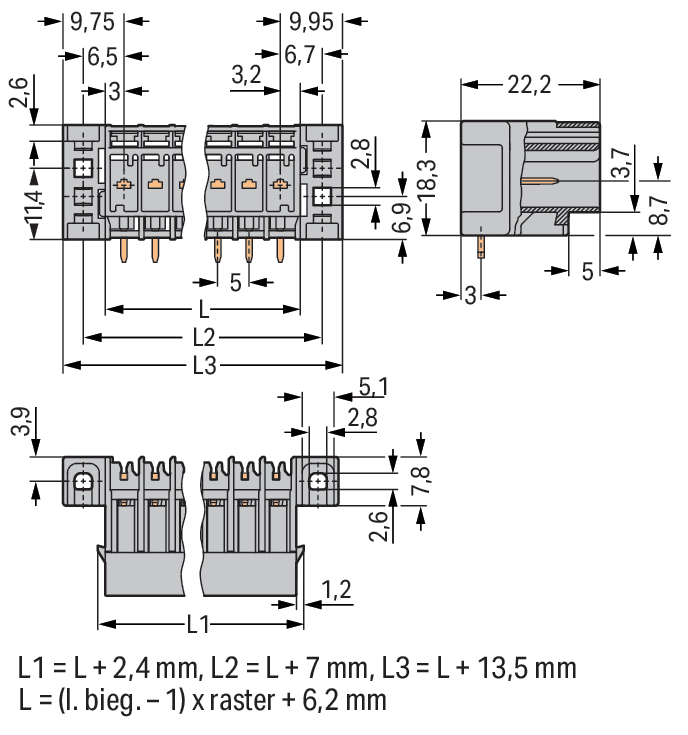 wtyk THT; pin lutowniczy 1,0 x 1,0 mm; konstrukcja kątowa; kołnierz mocujący; raster 5 mm; 3-bieg.; szary