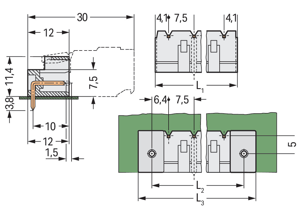 wtyk THT; pin lutowniczy 1,2 x 1,2 mm; konstrukcja kątowa; 100% ochrona przed błędnym połączeniem; raster 7,5 mm; 4-bieg.; jasnoszary