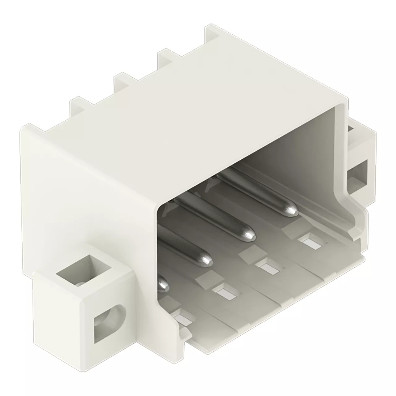 wtyk THT; pin lutowniczy Ø 1,4 mm; konstrukcja kątowa; kołnierz mocujący; raster 5 mm; 4-bieg.; jasnoszary