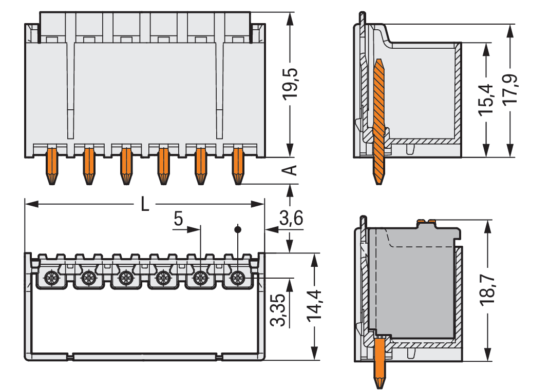 wtyk THT; pin lutowniczy Ø 1,4 mm; konstrukcja prosta; raster 5 mm; 8-bieg.; jasnoszary