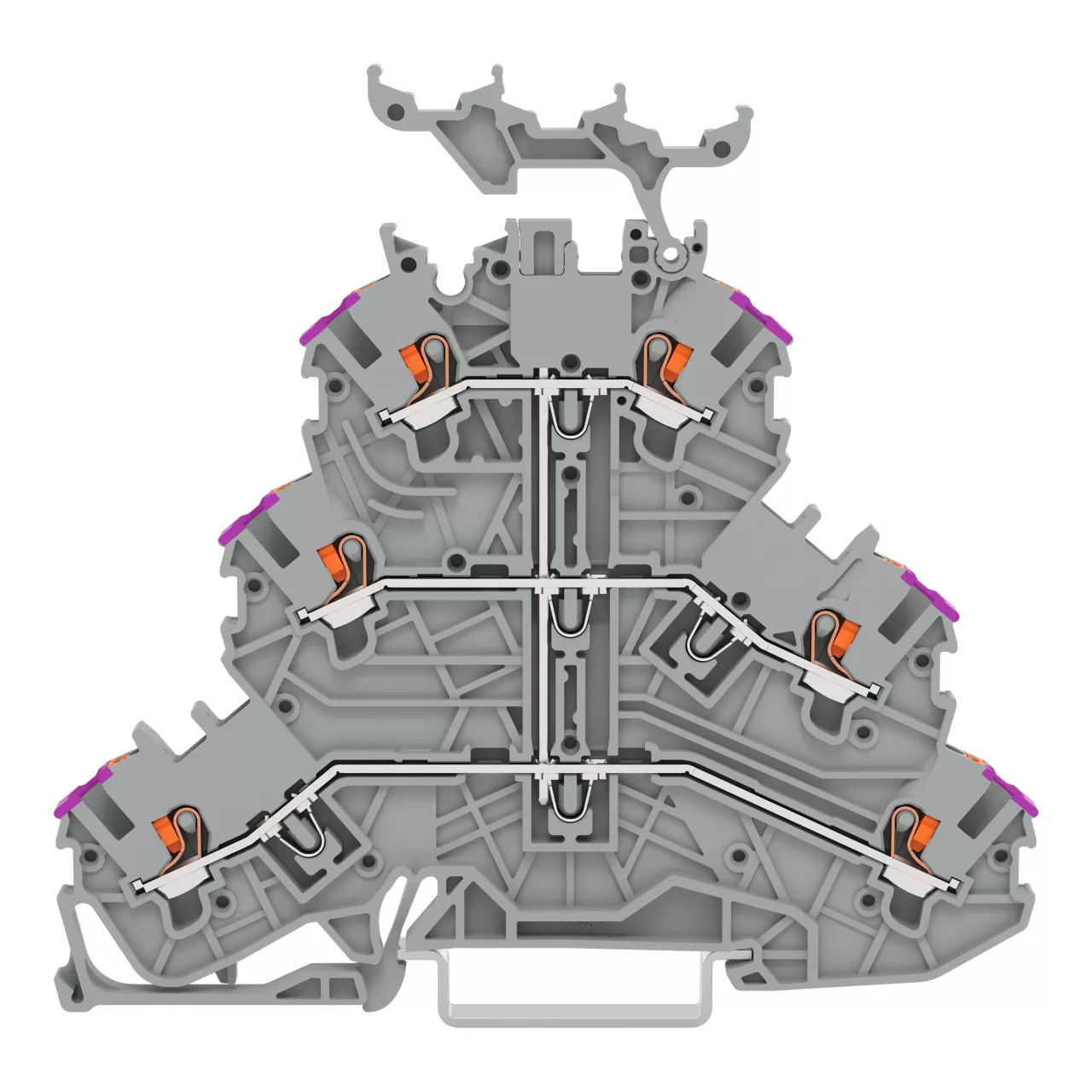 złączka 3-piętrowa; z przyciskami; złączka przelotowa 6-przewodowa; L; z podstawką oznacznika; do zastosowań Ex e II; z mostkowaniem wewnętrznym; otwory na przewody z fiolet. nadrukiem; na szynę TS 35 x 15 i 35 x 7,5; 1 mm²; Push-in CAGE CLAMP®; 1,00 mm²; szary