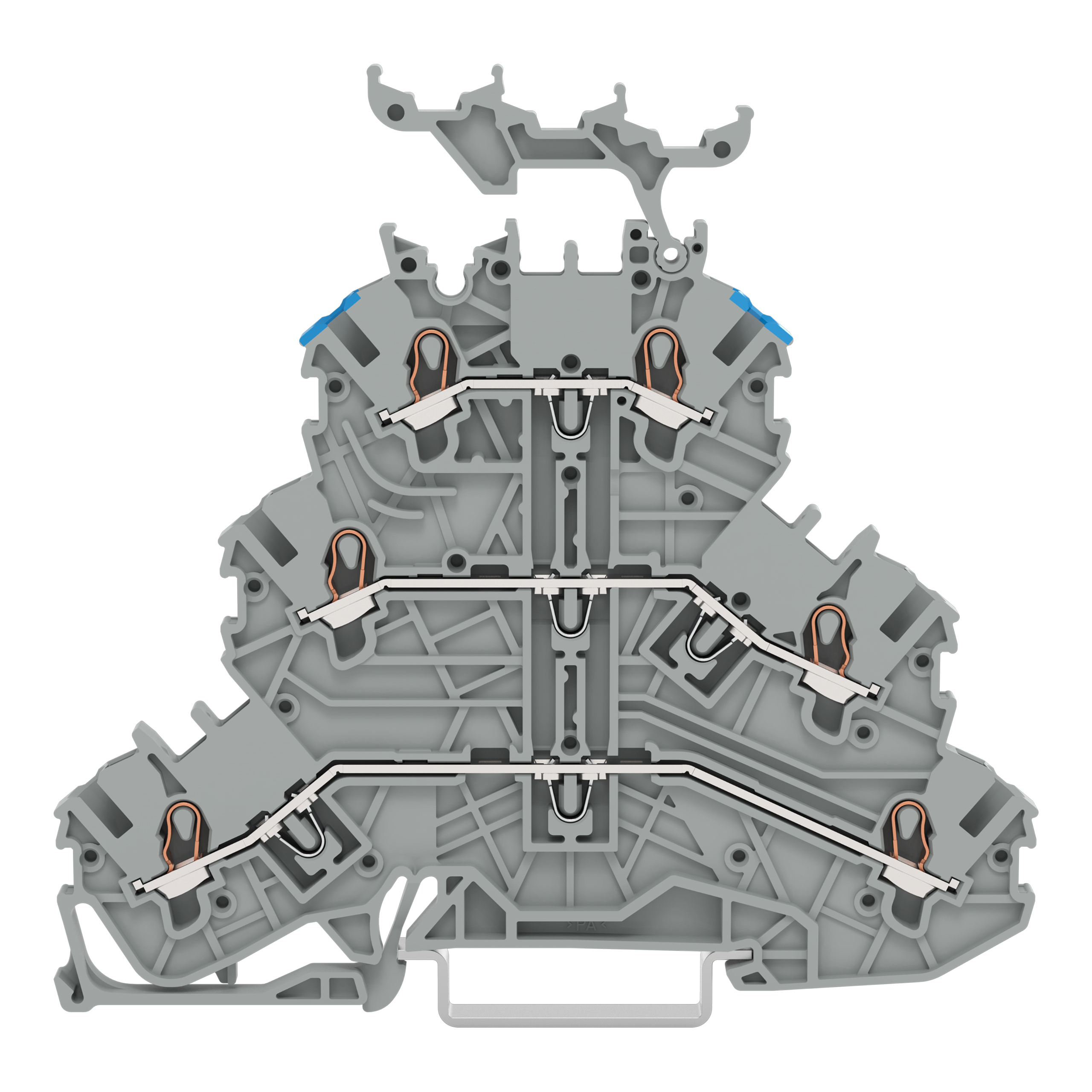 złączka 3-piętrowa; złączka przelotowa/przelotowa/przelotowa; L/L/N; z podstawką oznacznika; do zastosowań Ex e II; otwory na przewody piętro, nadruk nieb.; na szynę TS 35 x 15 i 35 x 7,5; 1 mm²; Push-in CAGE CLAMP®; 1,00 mm²; szary