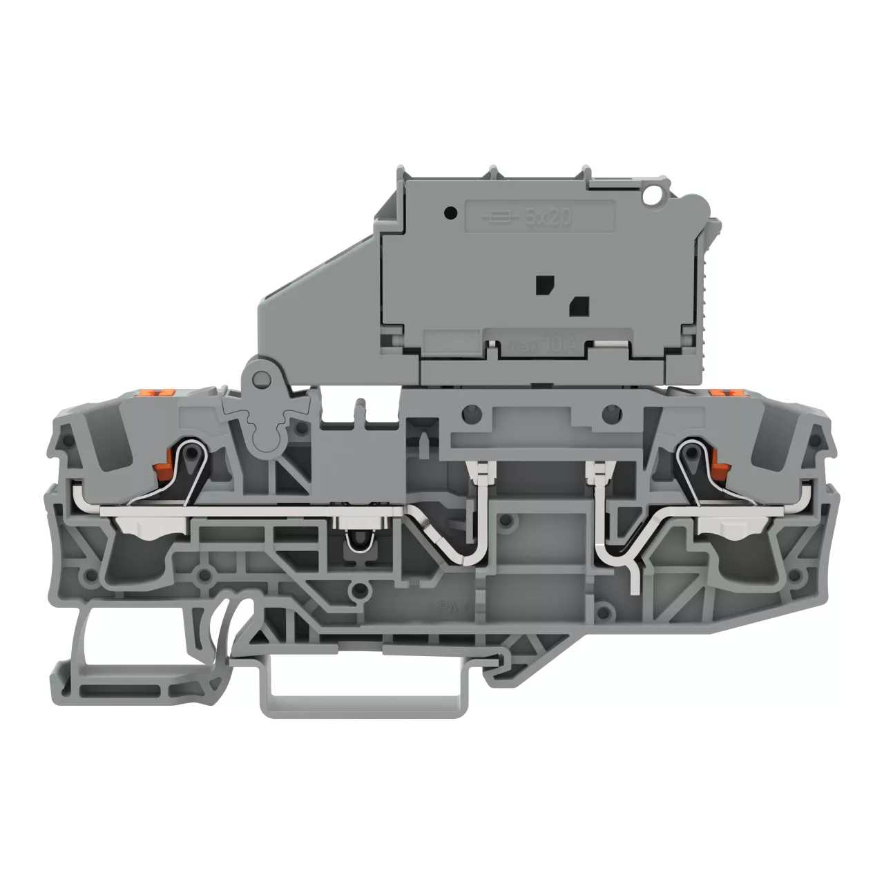 złączka bezpiecznikowa 2-przewodowa; z uchylną podstawką bezpiecznika; do wkładki bezpiecznikowej aparatowej 5 x 20 mm; z przyciskami; bez sygnalizacji przepalenia wkładki; na szynę TS 35 x 15 i 35 x 7,5; 6 mm²; Push-in CAGE CLAMP®; pomarańczowy
