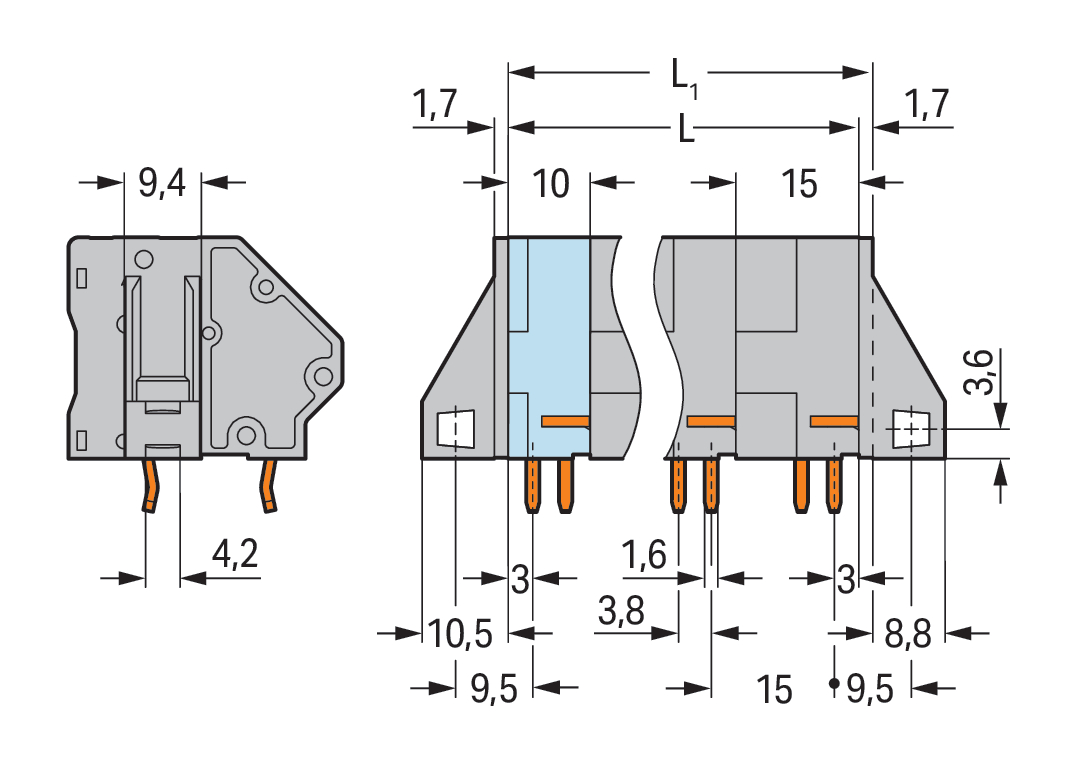 złącze do PCB; 16 mm²; raster 15 mm; 5-bieg.; CAGE CLAMP®; możliwość mostkowania; długość pinu lutowniczego 5 mm; szary