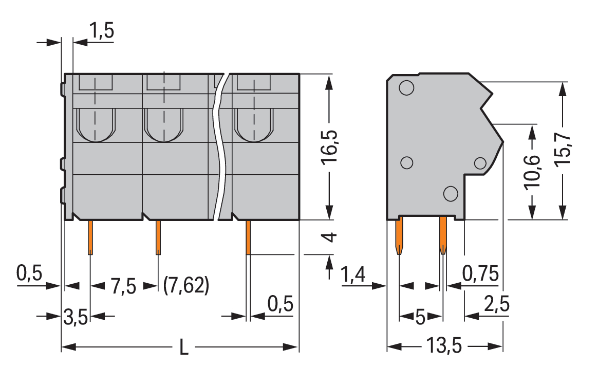Złączka do płytek drukowanych 2,5 mm² RM 7,5/7,62 mm 6-bieg, szara 254-556