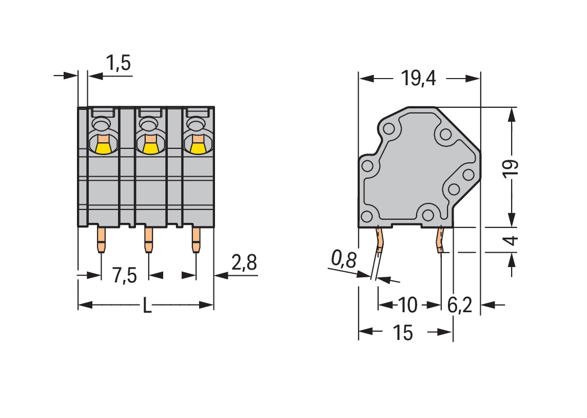 Złączka do płytek drukowanych 4 mm² RM 7,5 mm 6-bieg, szara 745-3156