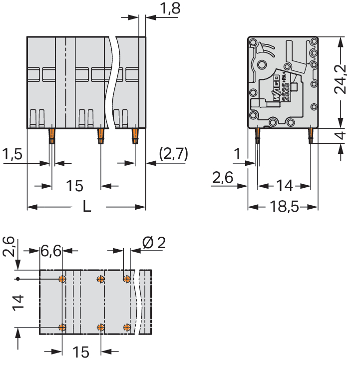 Złączka do płytek drukowanych 6 mm² raster 15mm 2-bieg, szara 2626-3452
