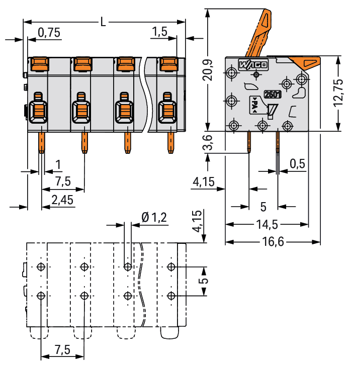 Złączka do płytek drukowanych dźwignia 1,5 mm² RM 7,5 mm 10-bieg, szara 2601-1310
