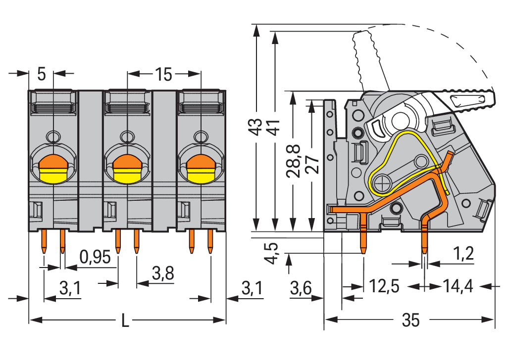 złącze do PCB; dźwignia; 16 mm²; raster 15 mm; 2-bieg.; CAGE CLAMP®; możliwość mostkowania; szary
