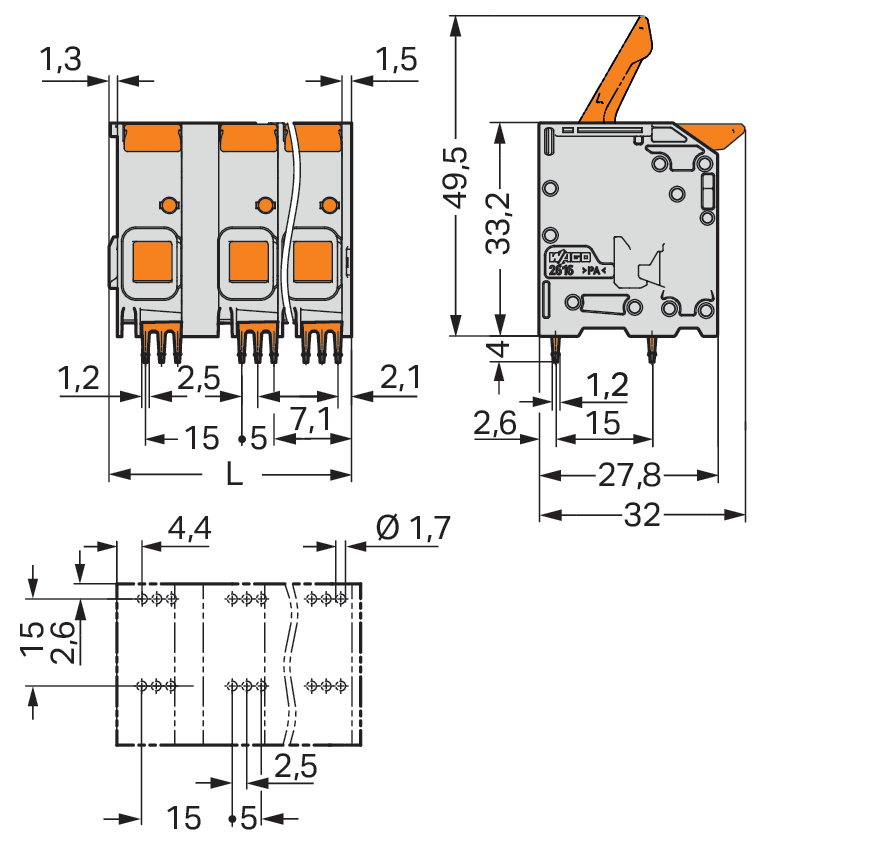 złącze do PCB; dźwignia; 16 mm²; raster 15 mm; 4-bieg.; Push-in CAGE CLAMP®; 16,00 mm²; szary