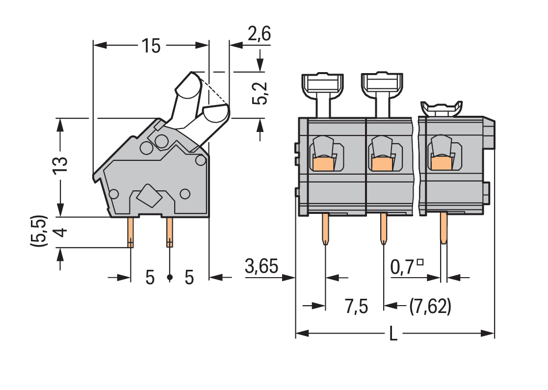 Złączka do płytek drukowanych przycisk 2,5 mm² RM 7,5/7,62 mm 4-bieg, szara 256-504