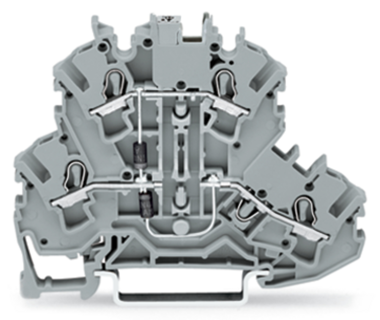złączka do zabudowy elementów; 2-piętr.; z 2 diodami 1N4007; anoda na górze, anoda po lewej; na szynę TS 35 x 15 i 35 x 7,5; 2,5 mm²; Push-in CAGE CLAMP®; 2,50 mm²; szary