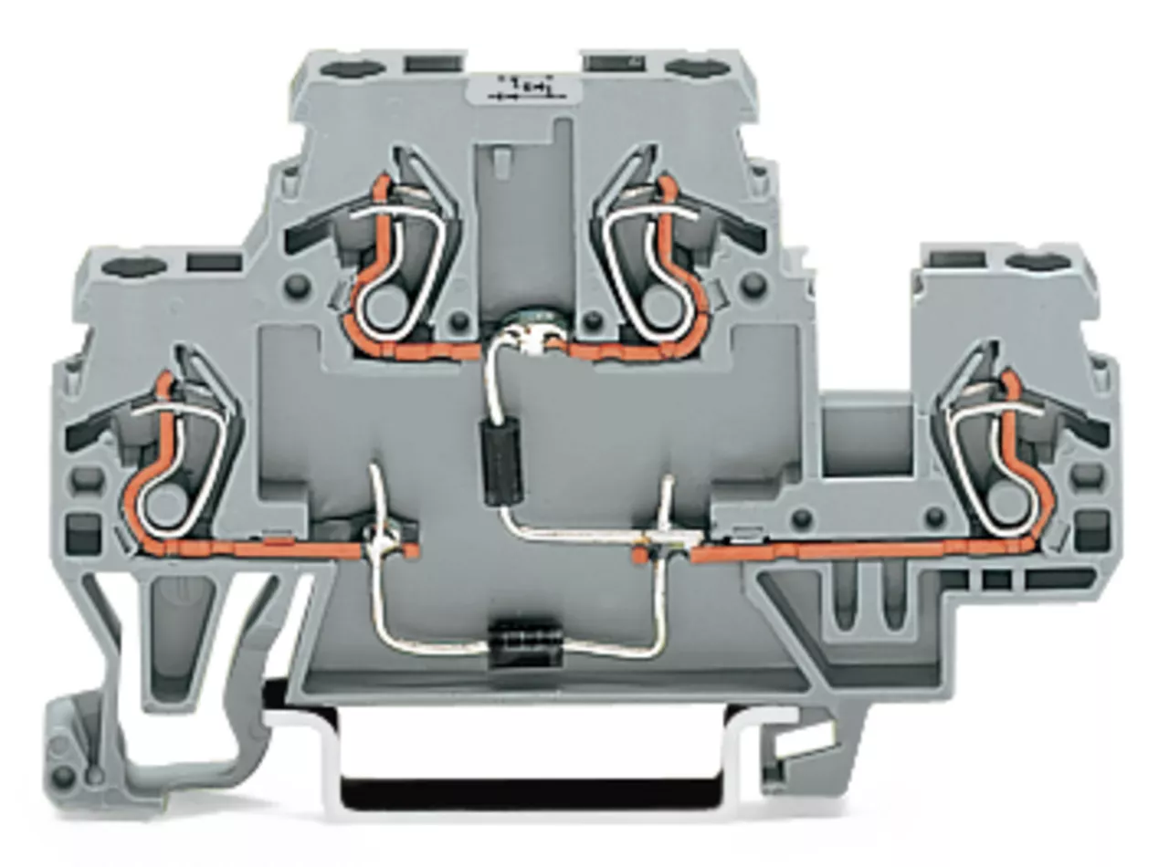 złączka do zabudowy elementów; 2-piętr.; z 2 diodami 1N4007; anoda na górze, anoda po prawej; na szynę TS 35 x 15 i 35 x 7,5; 2,5 mm²; CAGE CLAMP®; szary