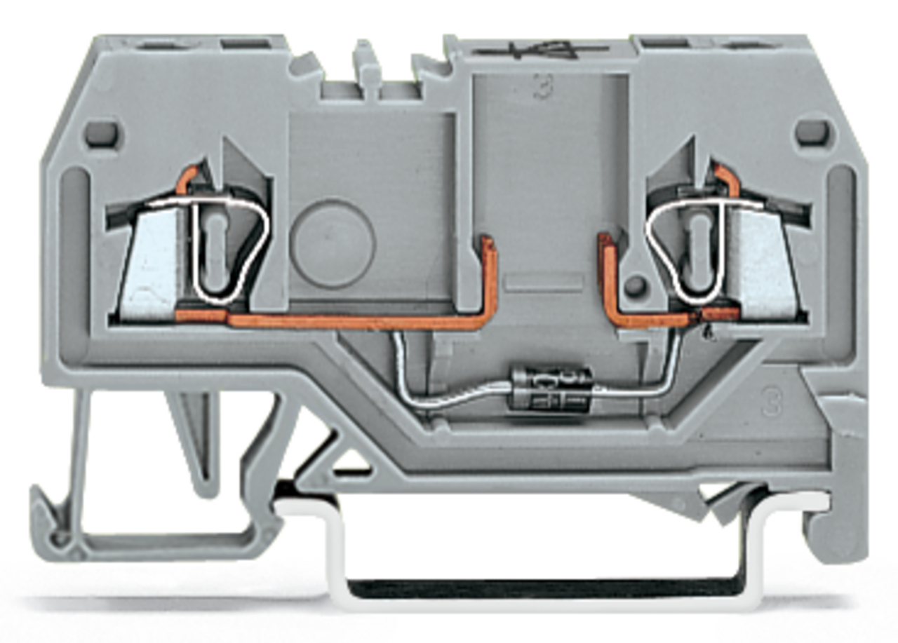złączka do zabudowy elementów; 2-przew.; z diodą 1N4007; anoda po lewej; na szynę TS 35 x 15 i 35 x 7,5; 1,5 mm²; CAGE CLAMP®; szary