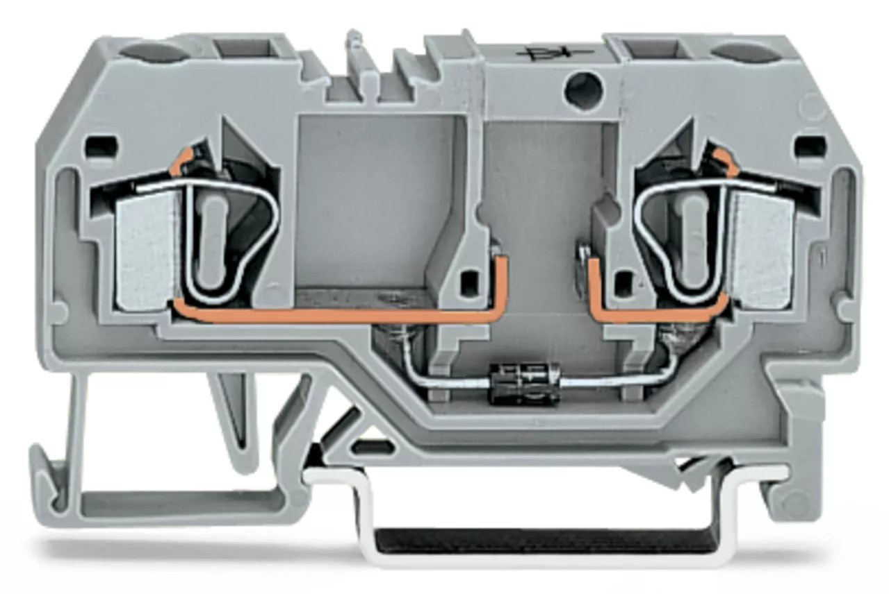 złączka do zabudowy elementów; 2-przew.; z diodą 1N5408; anoda po prawej; na szynę TS 35 x 15 i 35 x 7,5; 4 mm²; CAGE CLAMP®; szary