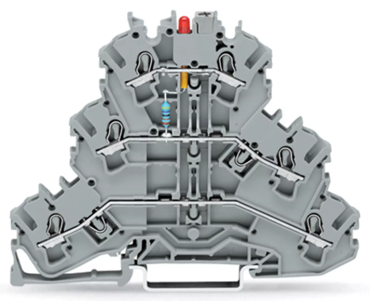 złączka do zabudowy elementów; 3-piętr.; LED czerwona; 24 V DC; na szynę TS 35 x 15 i 35 x 7,5; 2,5 mm²; Push-in CAGE CLAMP®; szary