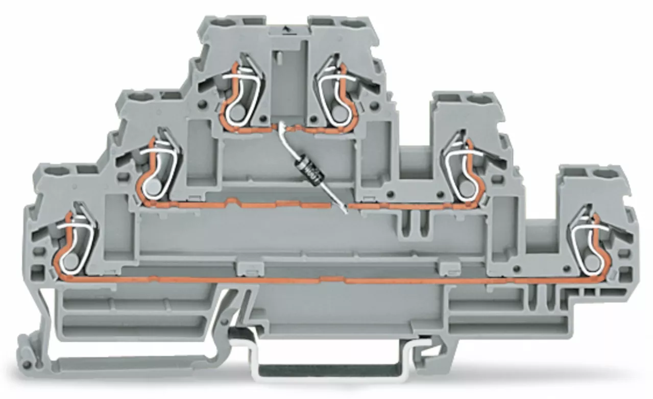 złączka do zabudowy elementów; 3-piętr.; z diodą 1N4007; anoda po lewej; na szynę TS 35 x 15 i 35 x 7,5; 2,5 mm²; CAGE CLAMP®; szary