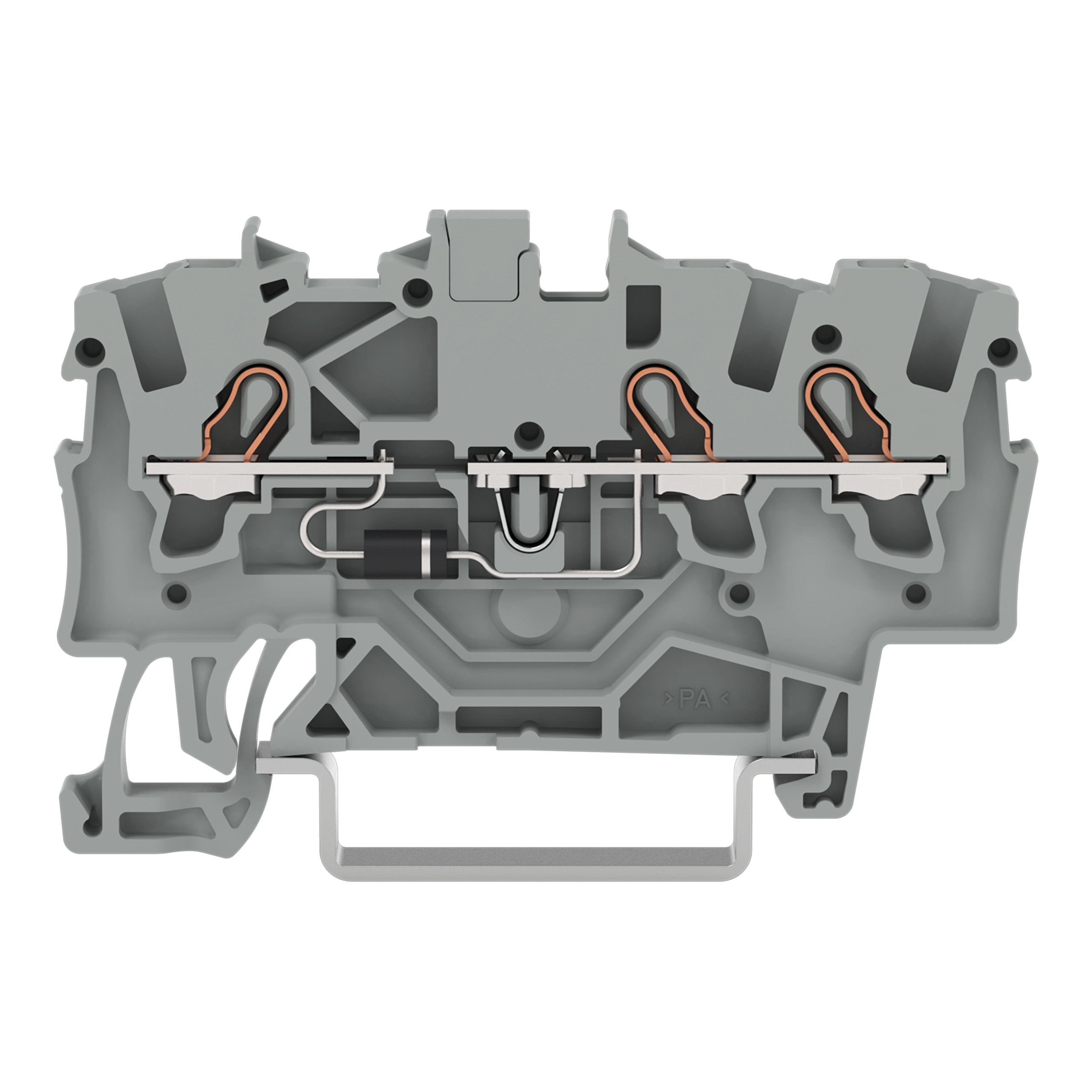 złączka do zabudowy elementów; 3-przew.; z diodą 1N4007; anoda po lewej; na szynę TS 35 x 15 i 35 x 7,5; 1,5 mm²; Push-in CAGE CLAMP®; 1,50 mm²; szary