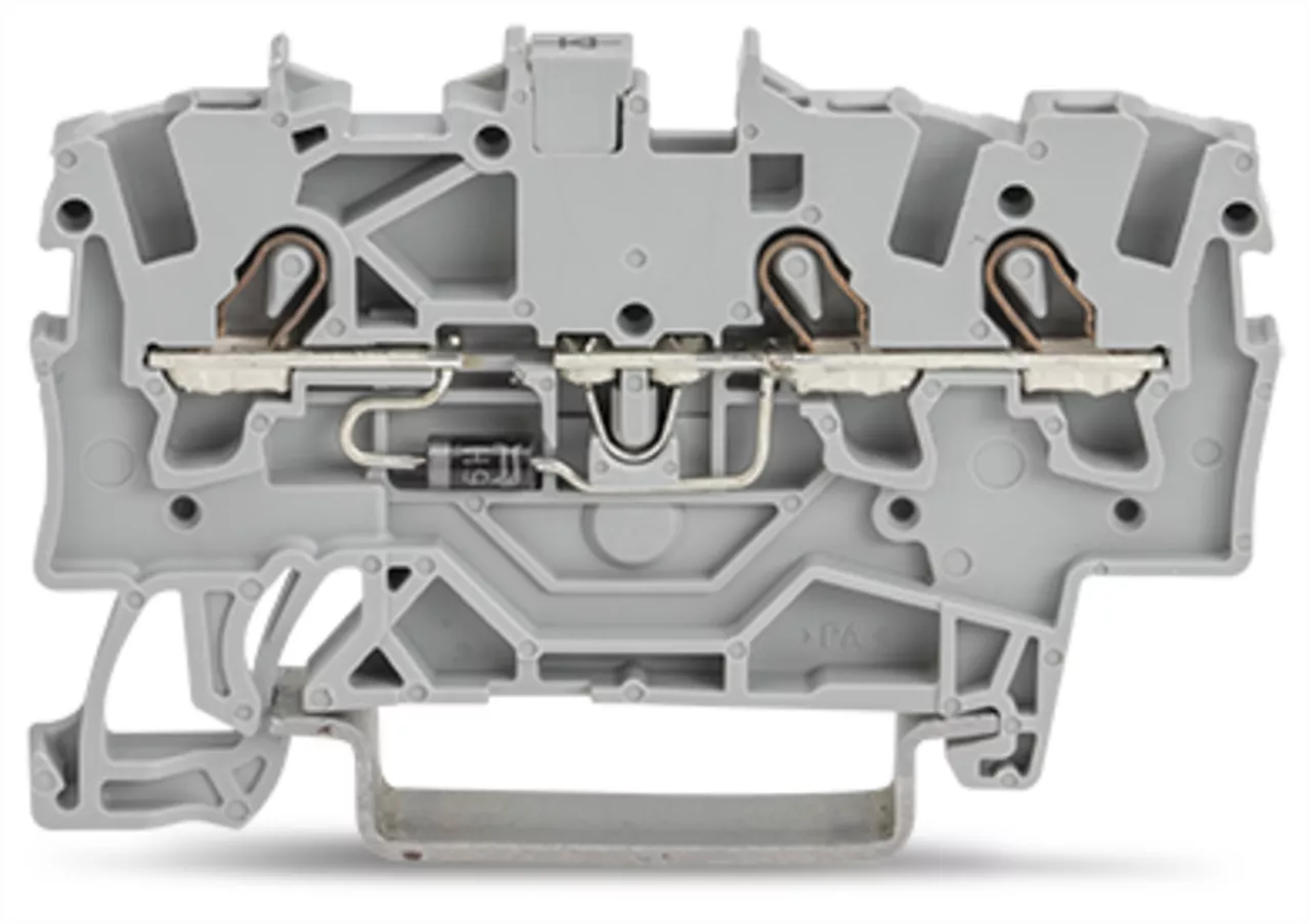 złączka do zabudowy elementów; 3-przew.; z diodą 1N4007; anoda po prawej; na szynę TS 35 x 15 i 35 x 7,5; 1,5 mm²; Push-in CAGE CLAMP®; 1,50 mm²; szary