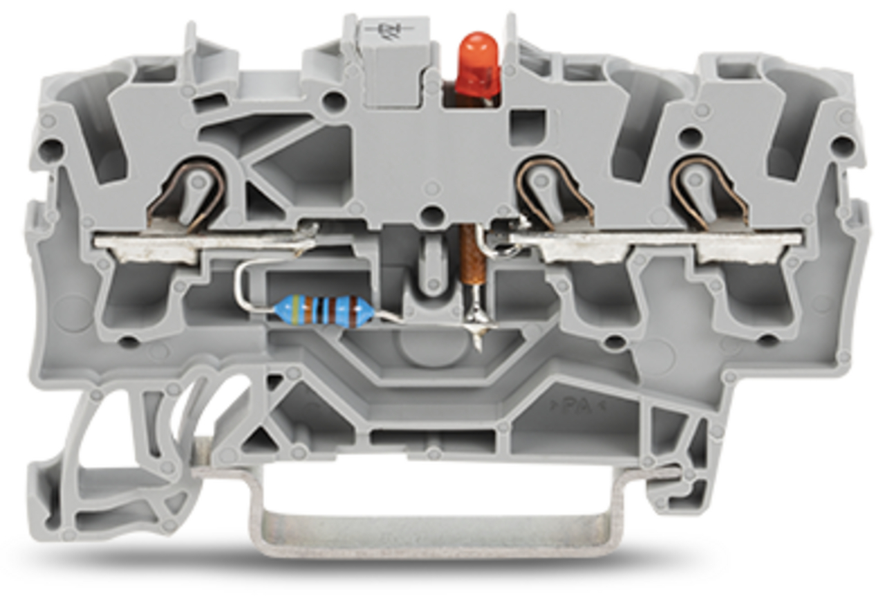 złączka do zabudowy elementów; 3-przew.; LED czerwona; 24 V DC; na szynę TS 35 x 15 i 35 x 7,5; 2,5 mm²; Push-in CAGE CLAMP®; szary