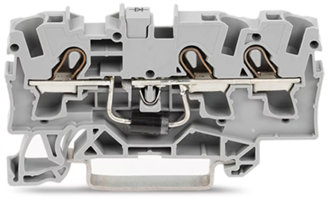 złączka do zabudowy elementów; 3-przew.; z diodą 1N5408; anoda po lewej; na szynę TS 35 x 15 i 35 x 7,5; 4 mm²; Push-in CAGE CLAMP®; szary