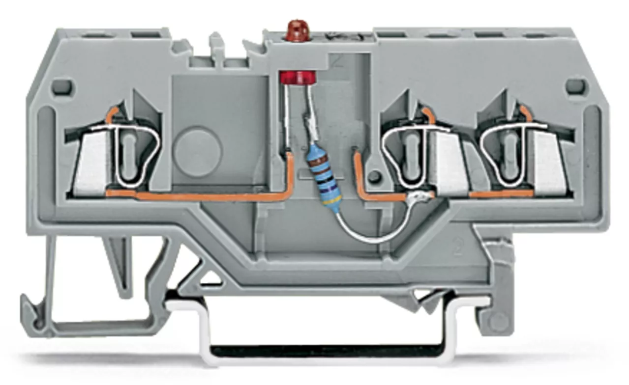 złączka do zabudowy elementów; 3-przew.; LED czerwona; 24 V DC; na szynę TS 35 x 15 i 35 x 7,5; 1,5 mm²; CAGE CLAMP®; szary