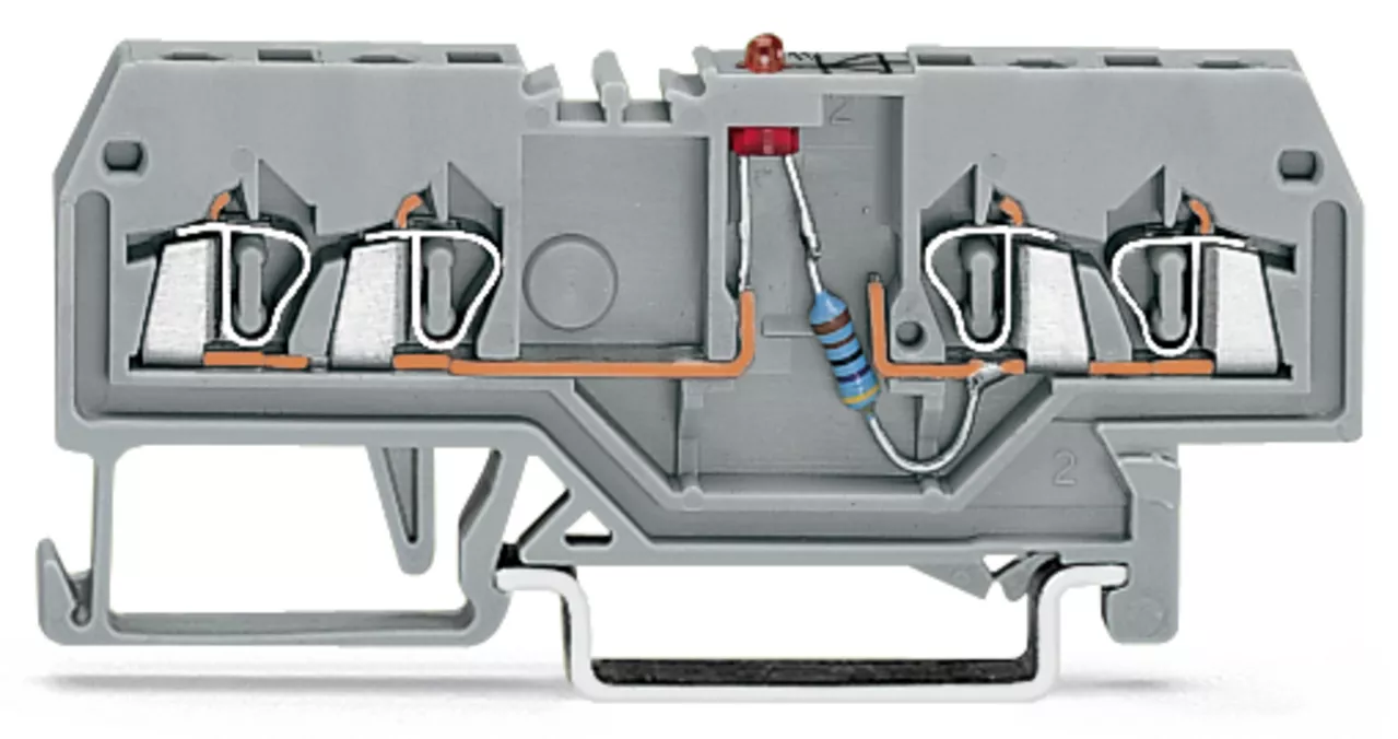 złączka do zabudowy elementów; 4-przew.; LED czerwona; 24 V DC; na szynę TS 35 x 15 i 35 x 7,5; 1,5 mm²; CAGE CLAMP®; szary