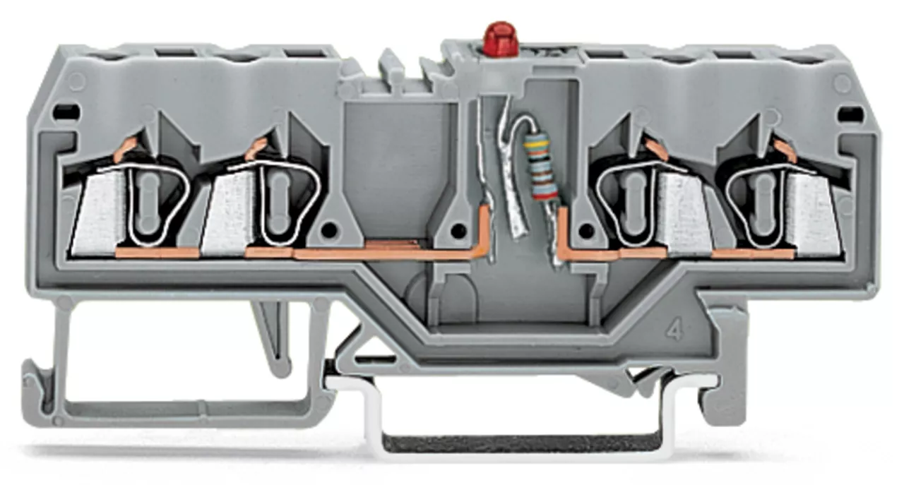 złączka do zabudowy elementów; 4-przew.; LED czerwona; 24 V DC; na szynę TS 35 x 15 i 35 x 7,5; 2,5 mm²; CAGE CLAMP®; szary