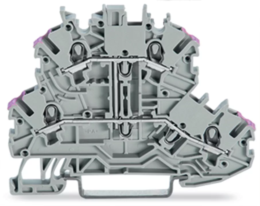 złączka 2-piętrowa; złączka przelotowa 4-przewodowa; L; bez podstawki oznacznika; z mostkowaniem wewnętrznym; otwory na przewody z fiolet. nadrukiem; na szynę TS 35 x 15 i 35 x 7,5; Push-in CAGE CLAMP®; 1,00 mm²; szary
