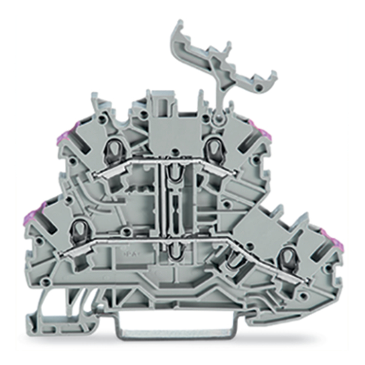 złączka 2-piętrowa; złączka przelotowa 4-przewodowa; L; z podstawką oznacznika; z mostkowaniem wewnętrznym; otwory na przewody z fiolet. nadrukiem; na szynę TS 35 x 15 i 35 x 7,5; Push-in CAGE CLAMP®; 1,00 mm²; szary