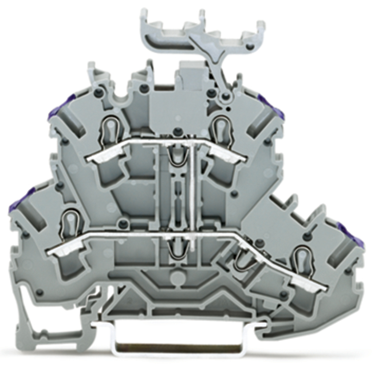 złączka 2-piętrowa; złączka przelotowa 4-przewodowa; L; z podstawką oznacznika; do zastosowań Ex e II; z mostkowaniem wewnętrznym; otwory na przewody z fiolet. nadrukiem; na szynę TS 35 x 15 i 35 x 7,5; 2,5 mm²; Push-in CAGE CLAMP®; 2,50 mm²; szary