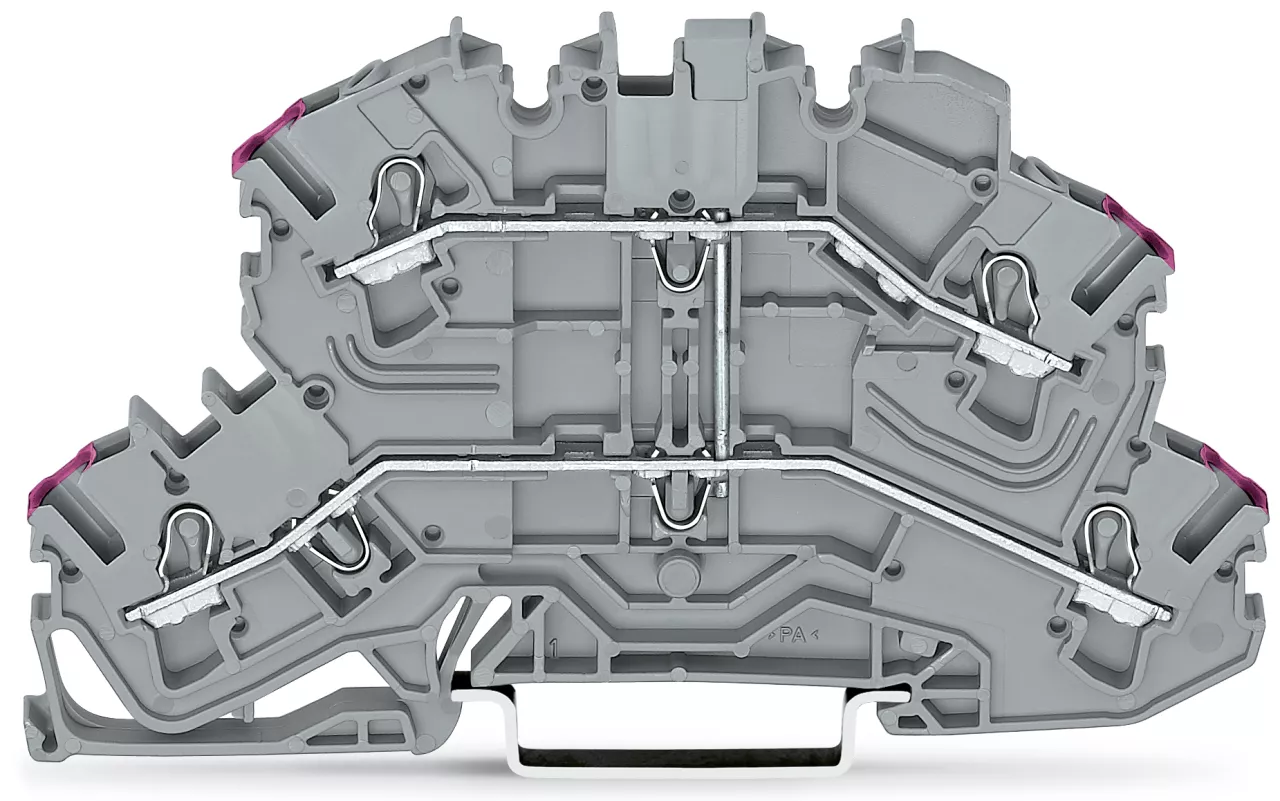 złączka 2-piętrowa; złączka przelotowa 4-przewodowa; o kształcie złączki rozłączalnej 2-piętrowej; L; bez podstawki oznacznika; z mostkowaniem wewnętrznym; otwory na przewody z fiolet. nadrukiem; na szynę TS 35 x 15 i 35 x 7,5; 2,5 mm²; Push-in CAGE CLAMP®; 2,50 mm²; szary