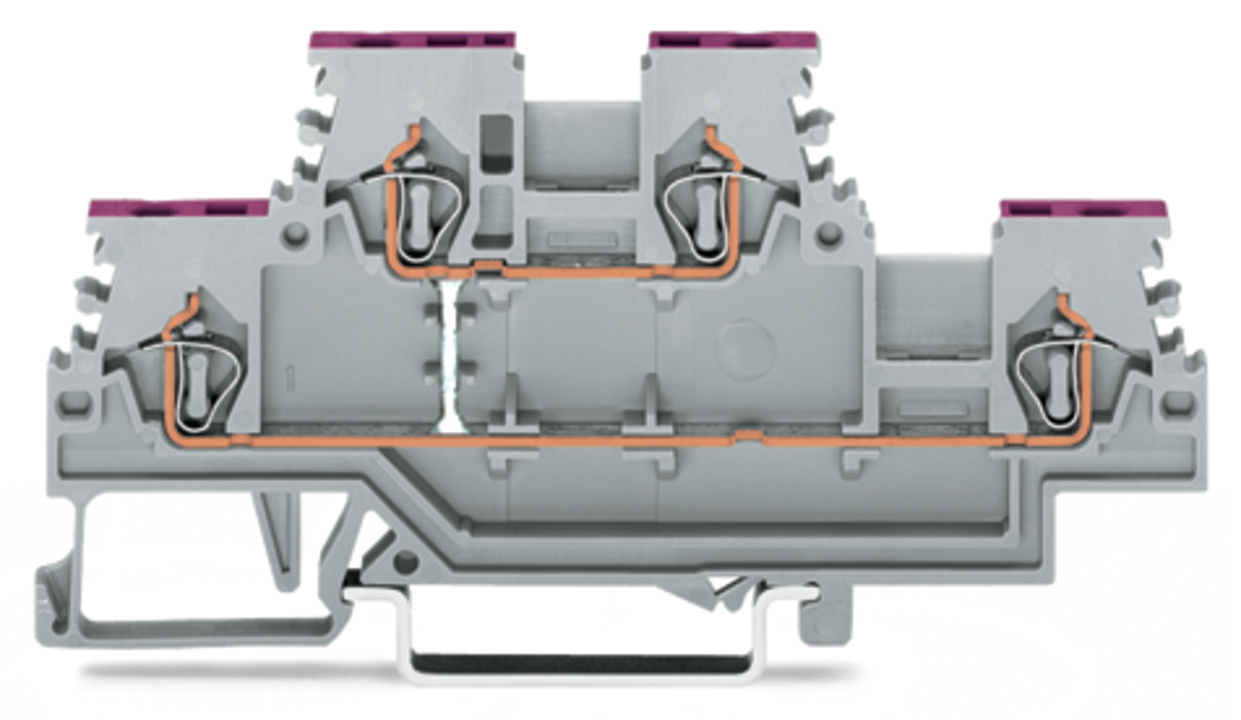 złączka 2-piętrowa; złączka przelotowa 4-przewodowa; L; do zastosowań Ex i; z mostkowaniem wewnętrznym; otwory na przewody z fiolet. nadrukiem; na szynę TS 35 x 15 i 35 x 7,5; 1,5 mm²; 1,50 mm²; szary