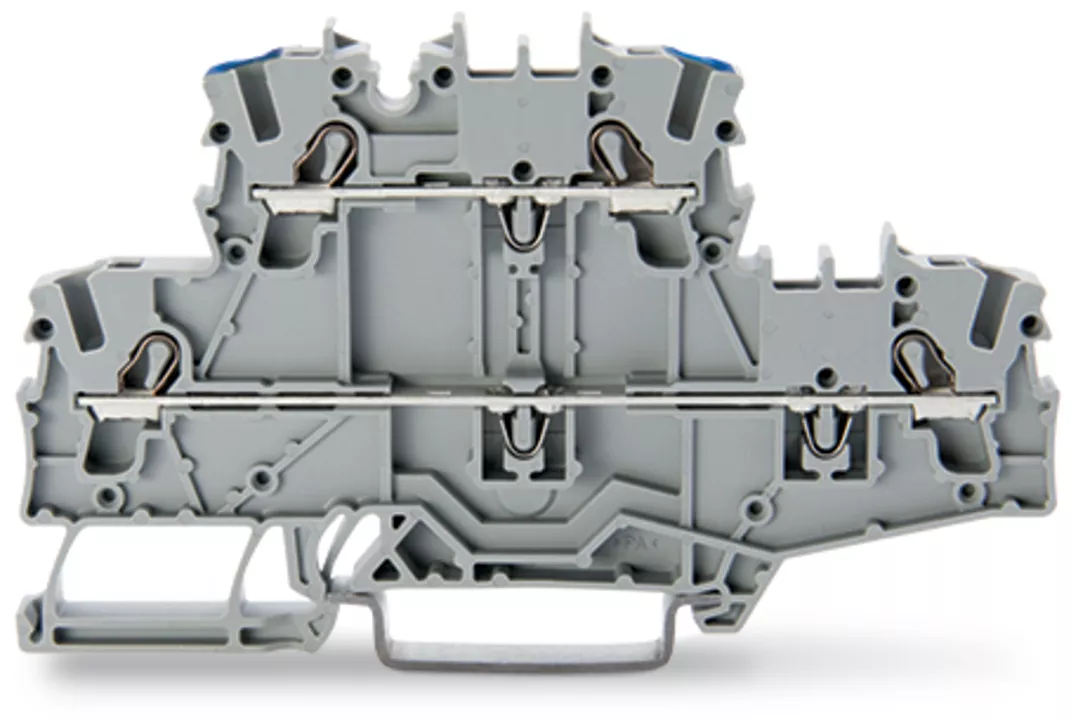złączka 2-piętrowa; złączka przelotowa/przelotowa; L/N; bez podstawki oznacznika; do zastosowań Ex e II; otwory na przewody piętro, nadruk nieb.; na szynę TS 35 x 15 i 35 x 7,5; 2,5 mm²; Push-in CAGE CLAMP®; 2,50 mm²; szary