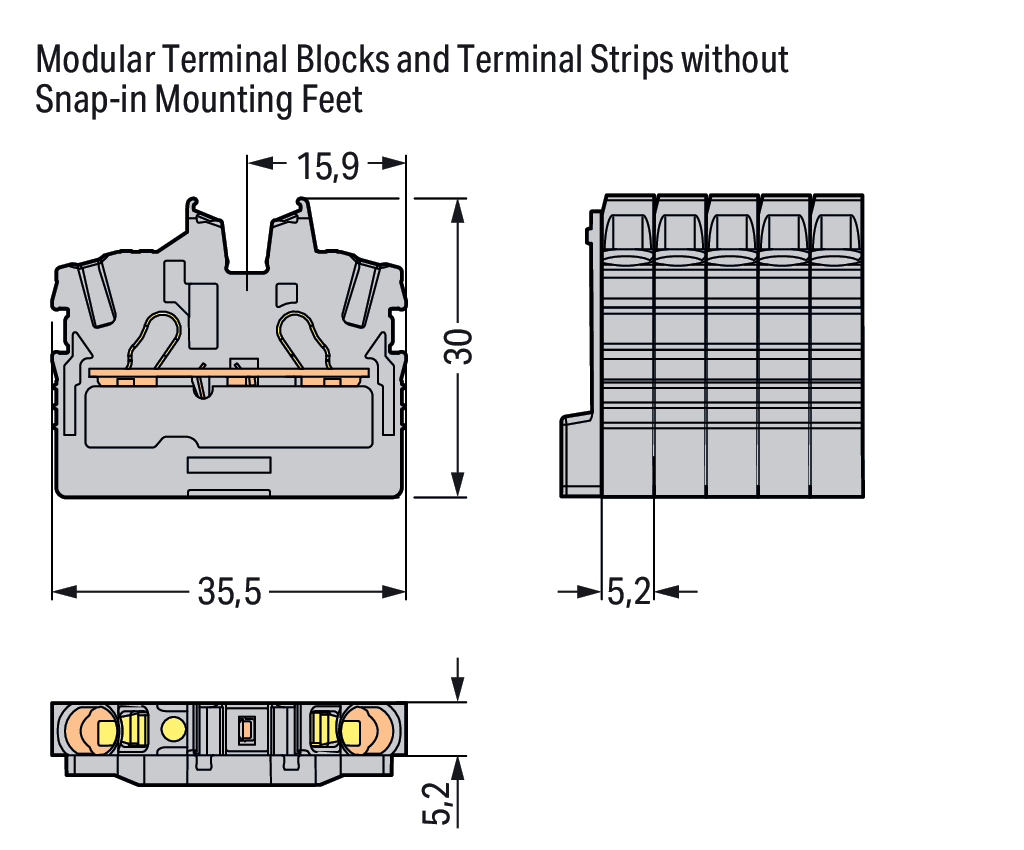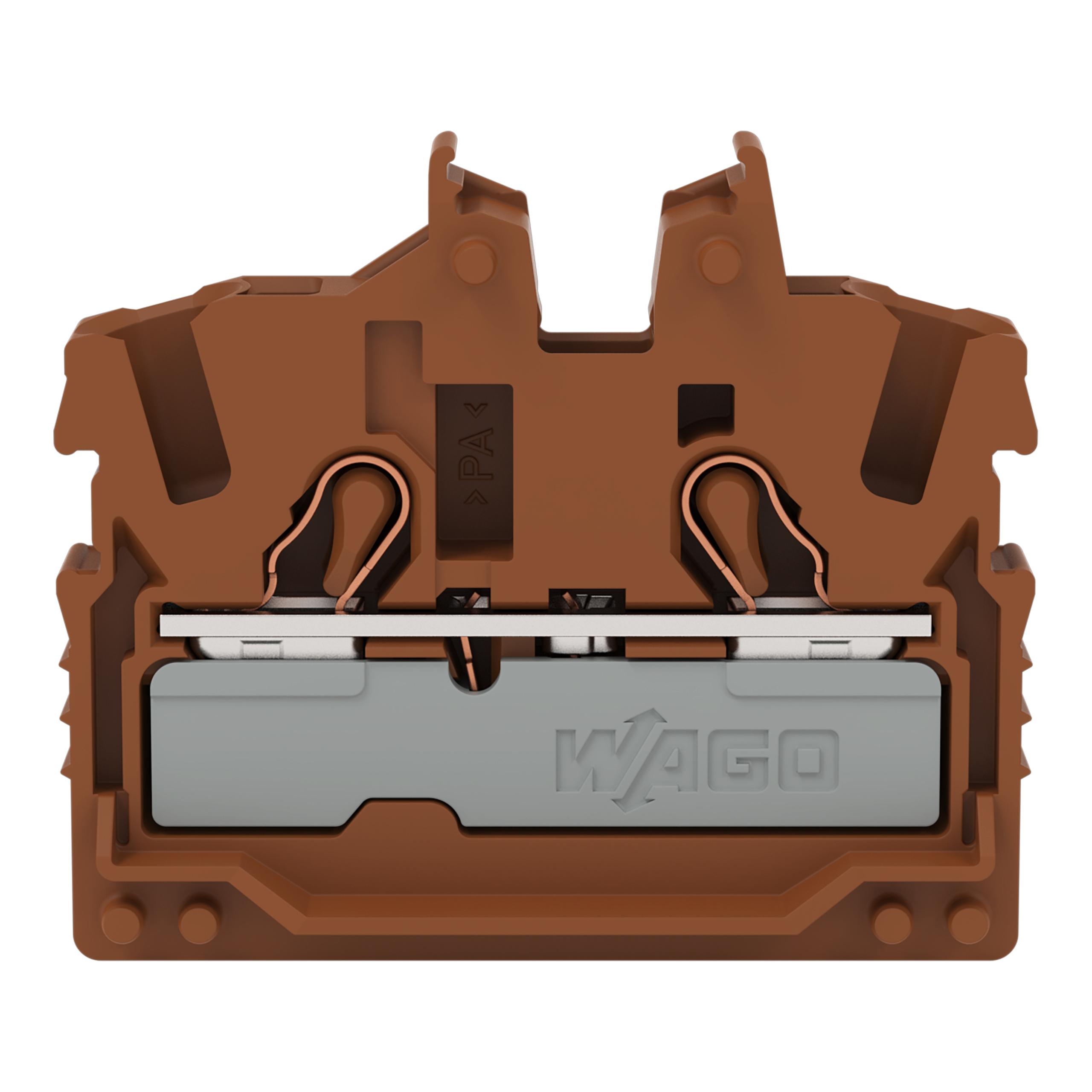 złączka przelotowa Mini 2-przewodowa; z otworem montażowym; 2,5 mm²; zł. wewn. bez stopki zatrz. bez uchwytu; opis z boku i na środku; z otworem pomiarowym; Push-in CAGE CLAMP®; 2,50 mm²; brązowy