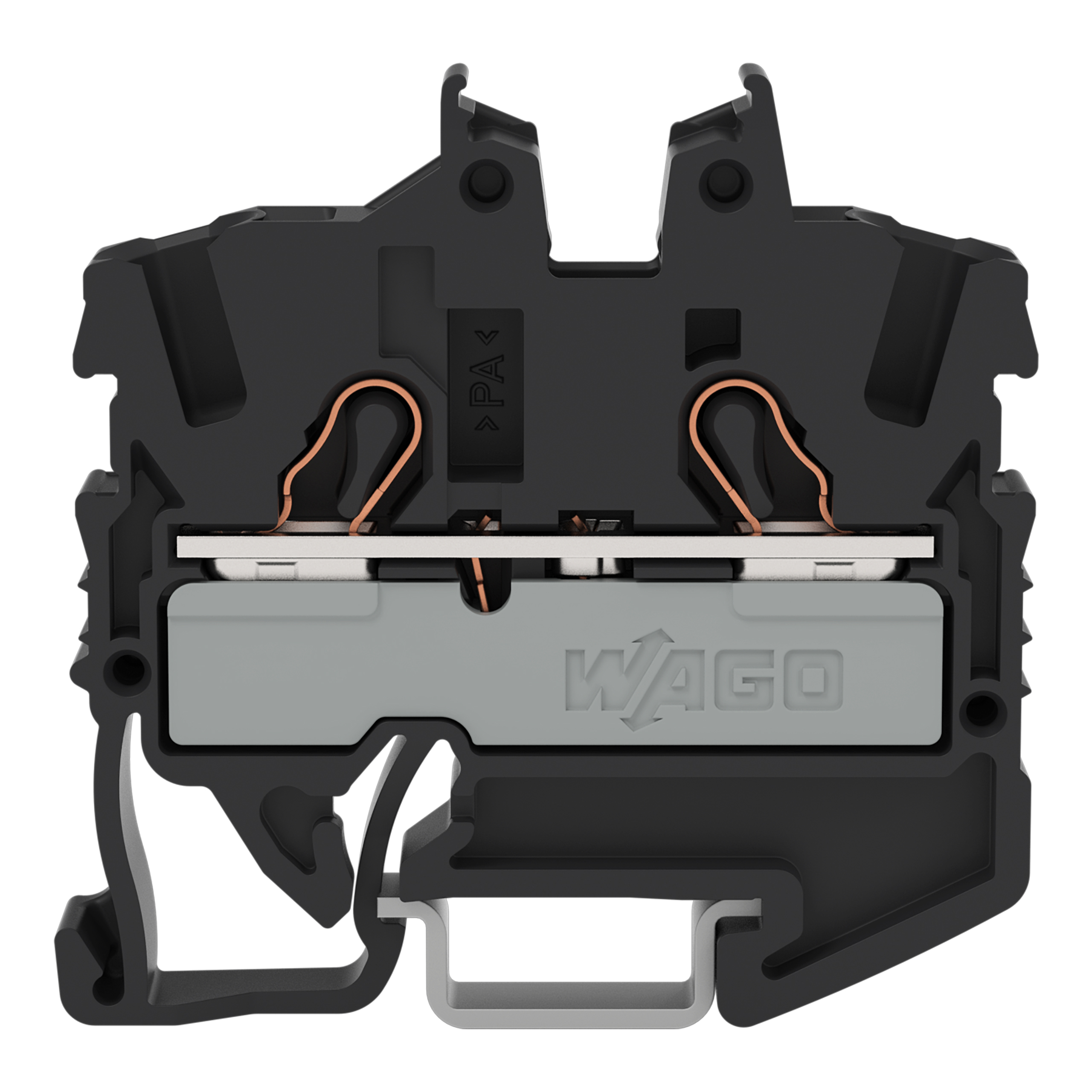złączka przelotowa Mini 2-przewodowa; z otworem montażowym; 2,5 mm²; z otworem pomiarowym; opis z boku i na środku; na szynę 15; Push-in CAGE CLAMP®; 2,50 mm²; czarny