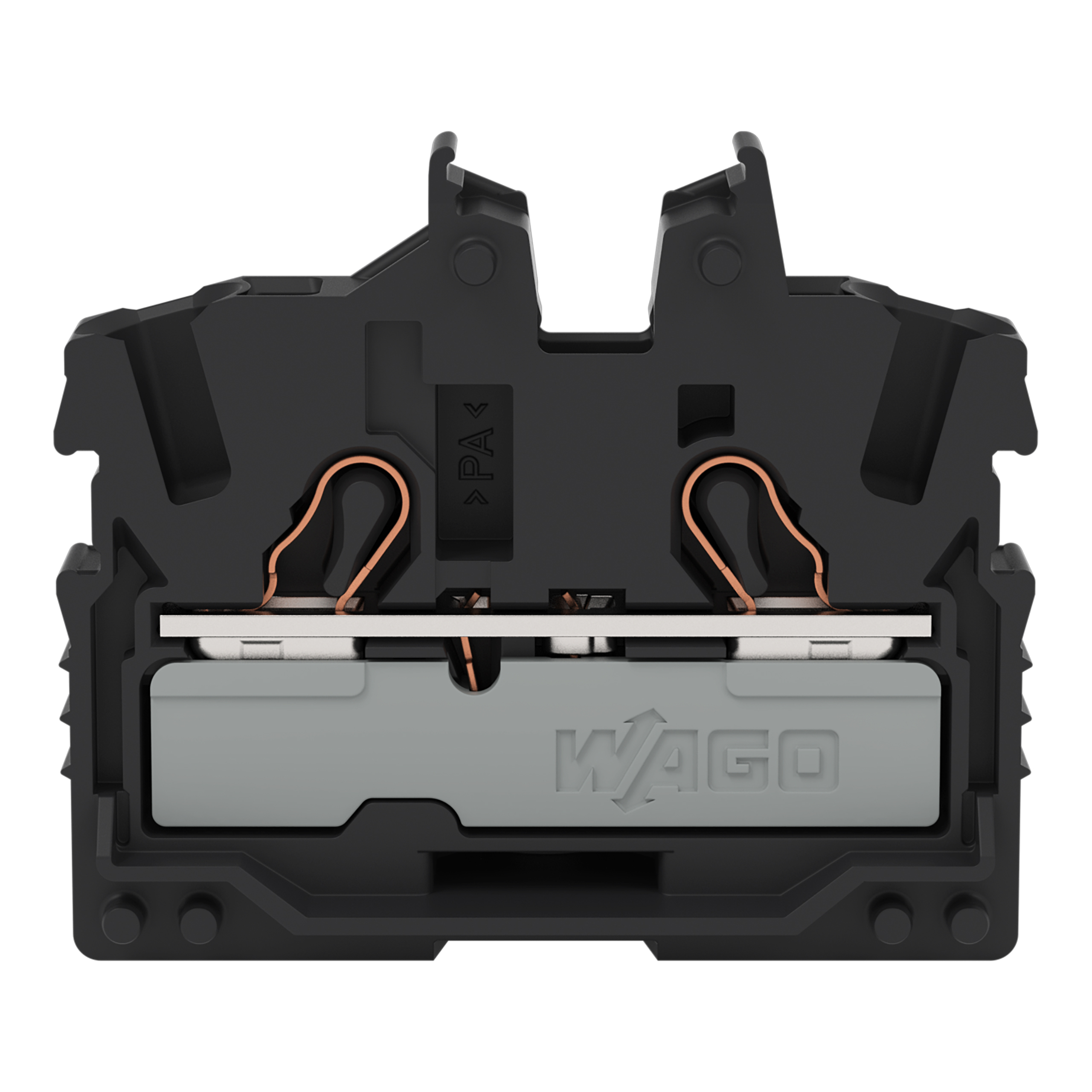 złączka przelotowa Mini 2-przewodowa; z otworem montażowym; 2,5 mm²; złączka końcowa z uchwytem montażowym; opis z boku i na środku; z otworem pomiarowym; Push-in CAGE CLAMP®; 2,50 mm²; czarny