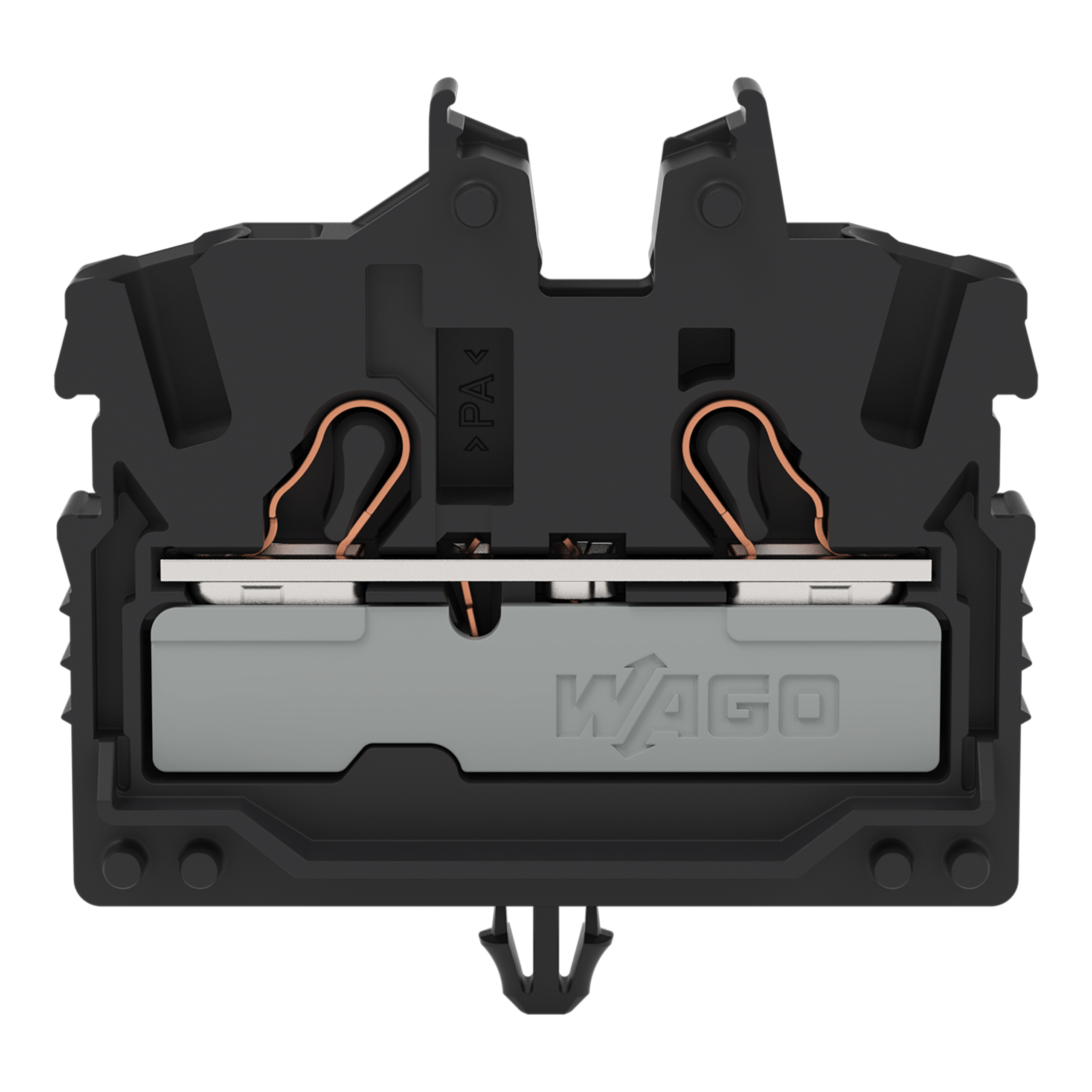 złączka przelotowa Mini 2-przewodowa; z otworem montażowym; 2,5 mm²; ze stopką zatrzaskową; opis z boku i na środku; z otworem pomiarowym; Push-in CAGE CLAMP®; 2,50 mm²; czarny