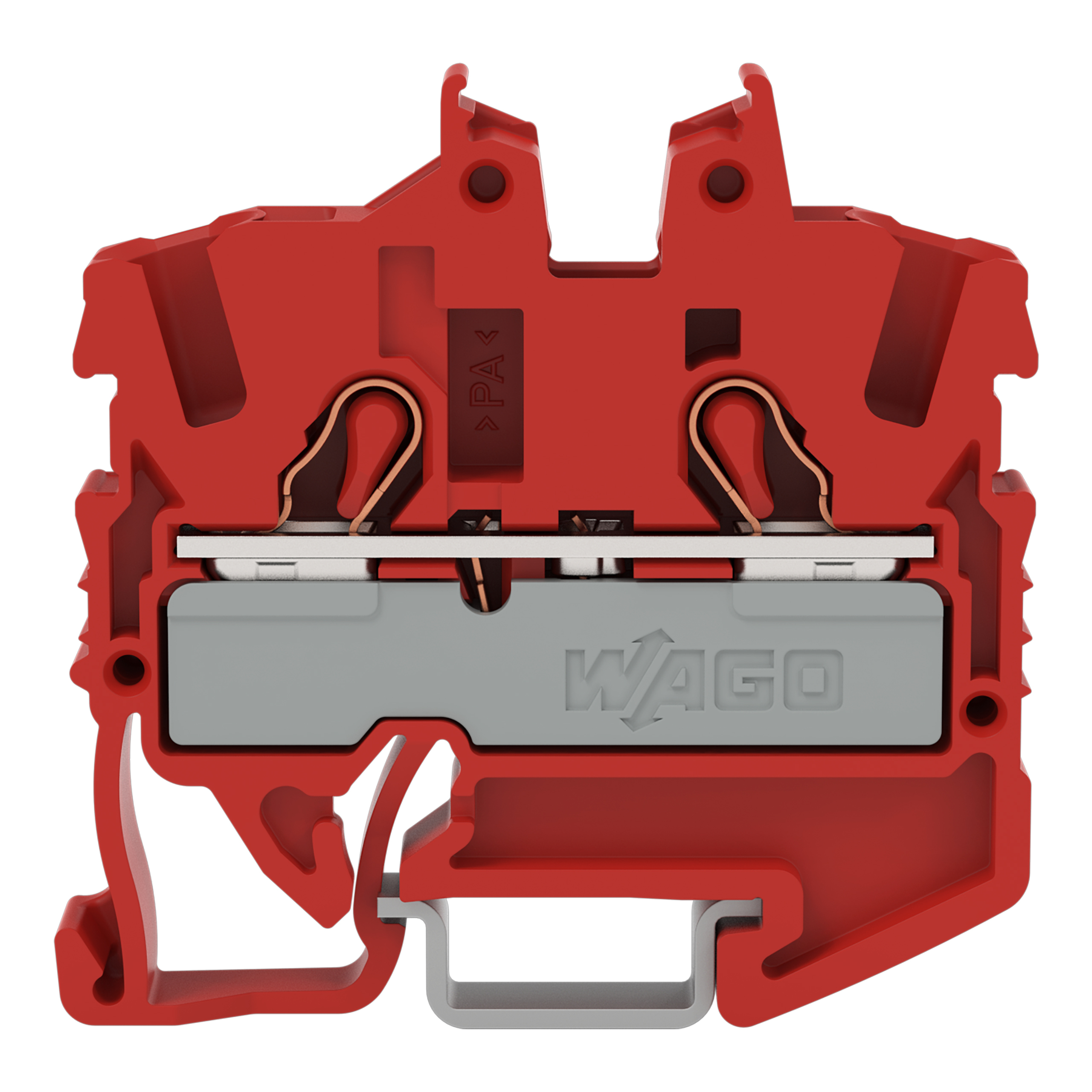 złączka przelotowa Mini 2-przewodowa; z otworem montażowym; 2,5 mm²; z otworem pomiarowym; opis z boku i na środku; na szynę 15; Push-in CAGE CLAMP®; 2,50 mm²; czerwony