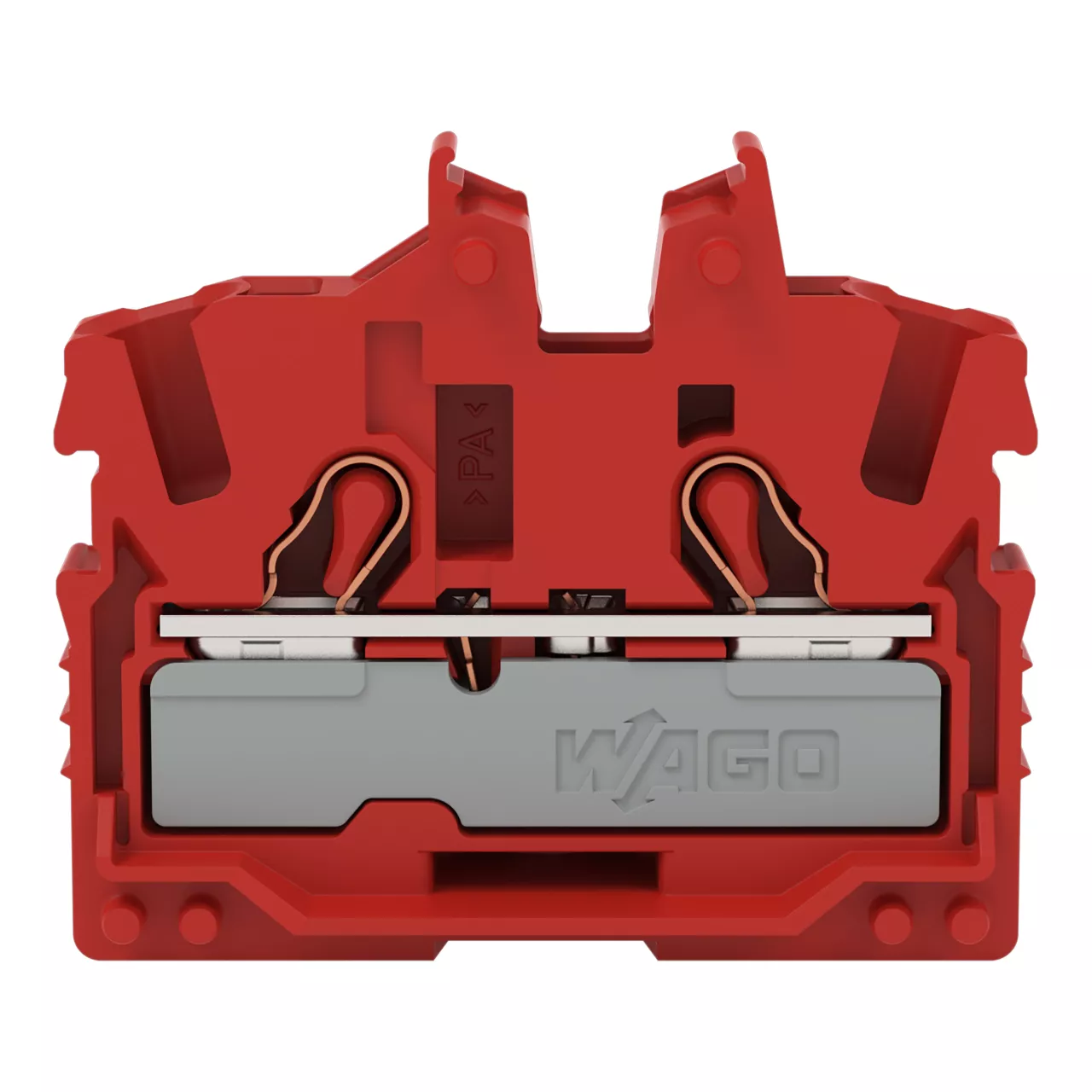 złączka przelotowa Mini 2-przewodowa; z otworem montażowym; 2,5 mm²; złączka końcowa z uchwytem montażowym; opis z boku i na środku; z otworem pomiarowym; Push-in CAGE CLAMP®; 2,50 mm²; czerwony