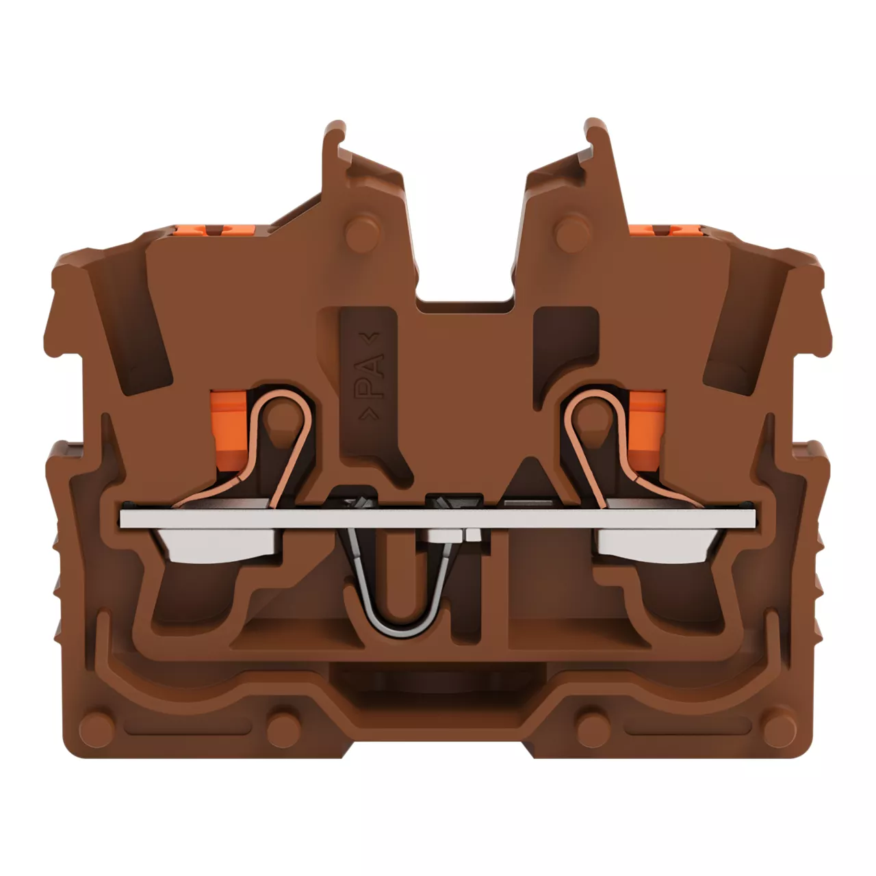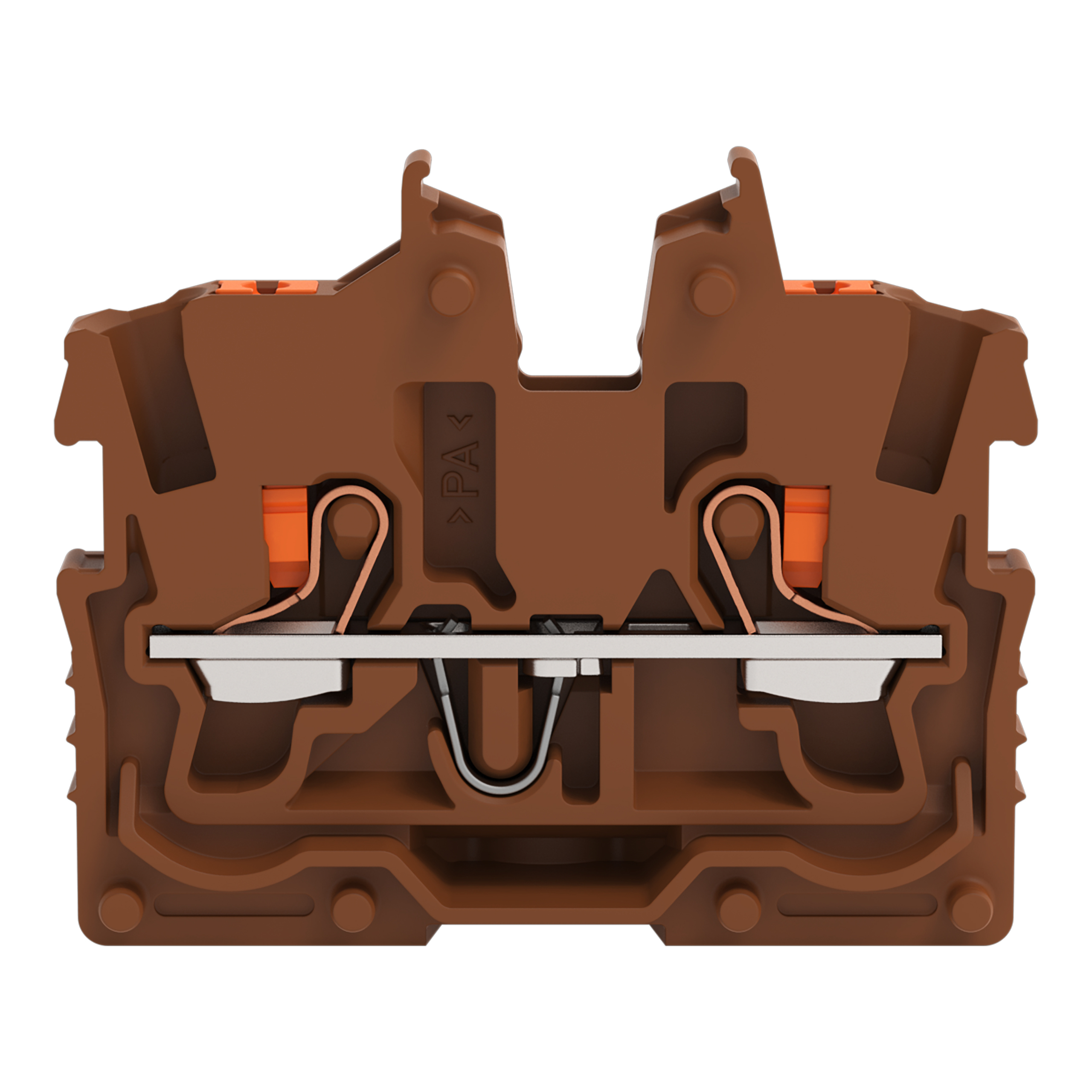 złączka przelotowa Mini 2-przewodowa; z przyciskami; 1 mm²; złączka końcowa z uchwytem montażowym; opis z boku i na środku; z otworem pomiarowym; Push-in CAGE CLAMP®; 1,00 mm²; brązowy