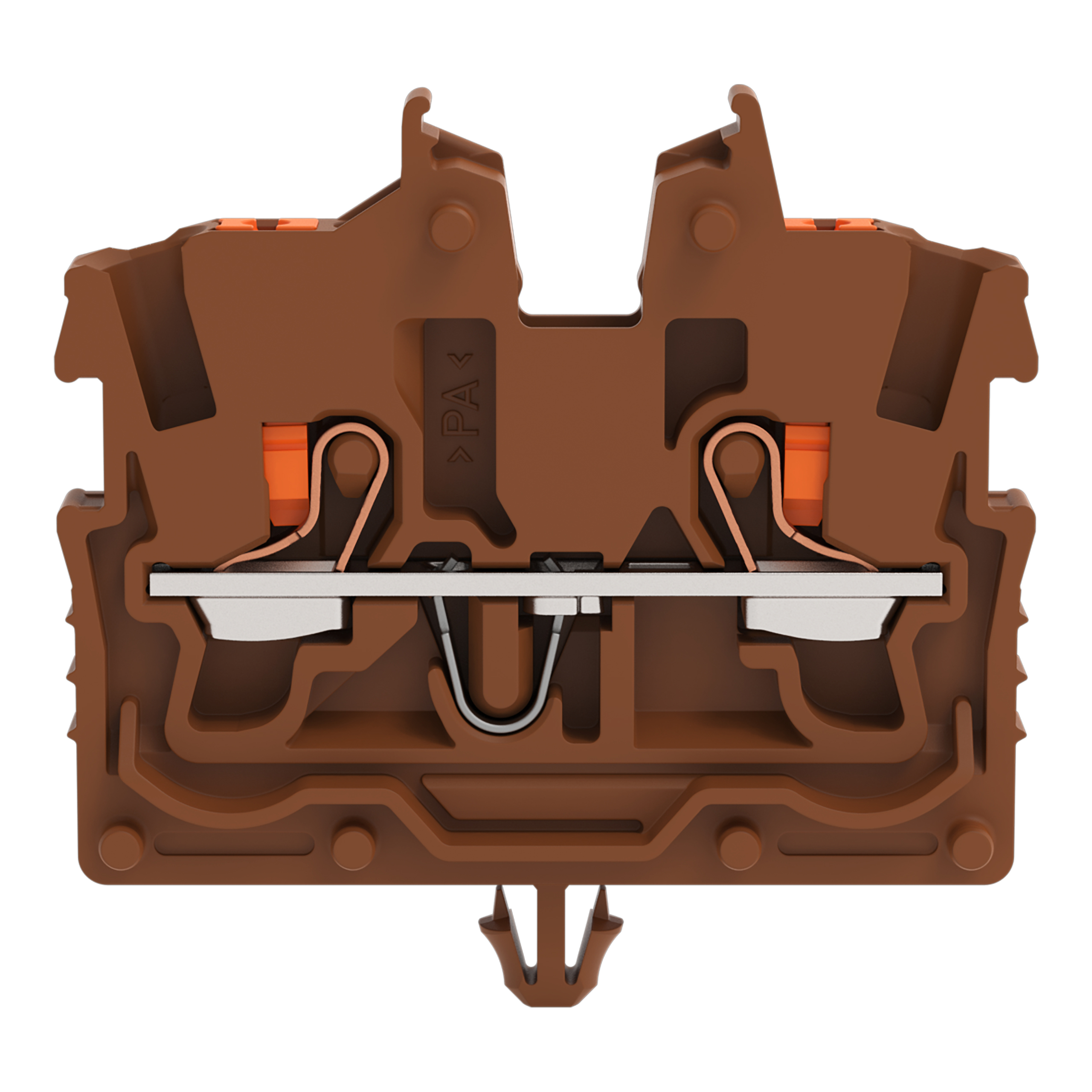 złączka przelotowa Mini 2-przewodowa; z przyciskami; 1 mm²; ze stopką zatrzaskową; opis z boku i na środku; z otworem pomiarowym; Push-in CAGE CLAMP®; 1,00 mm²; brązowy