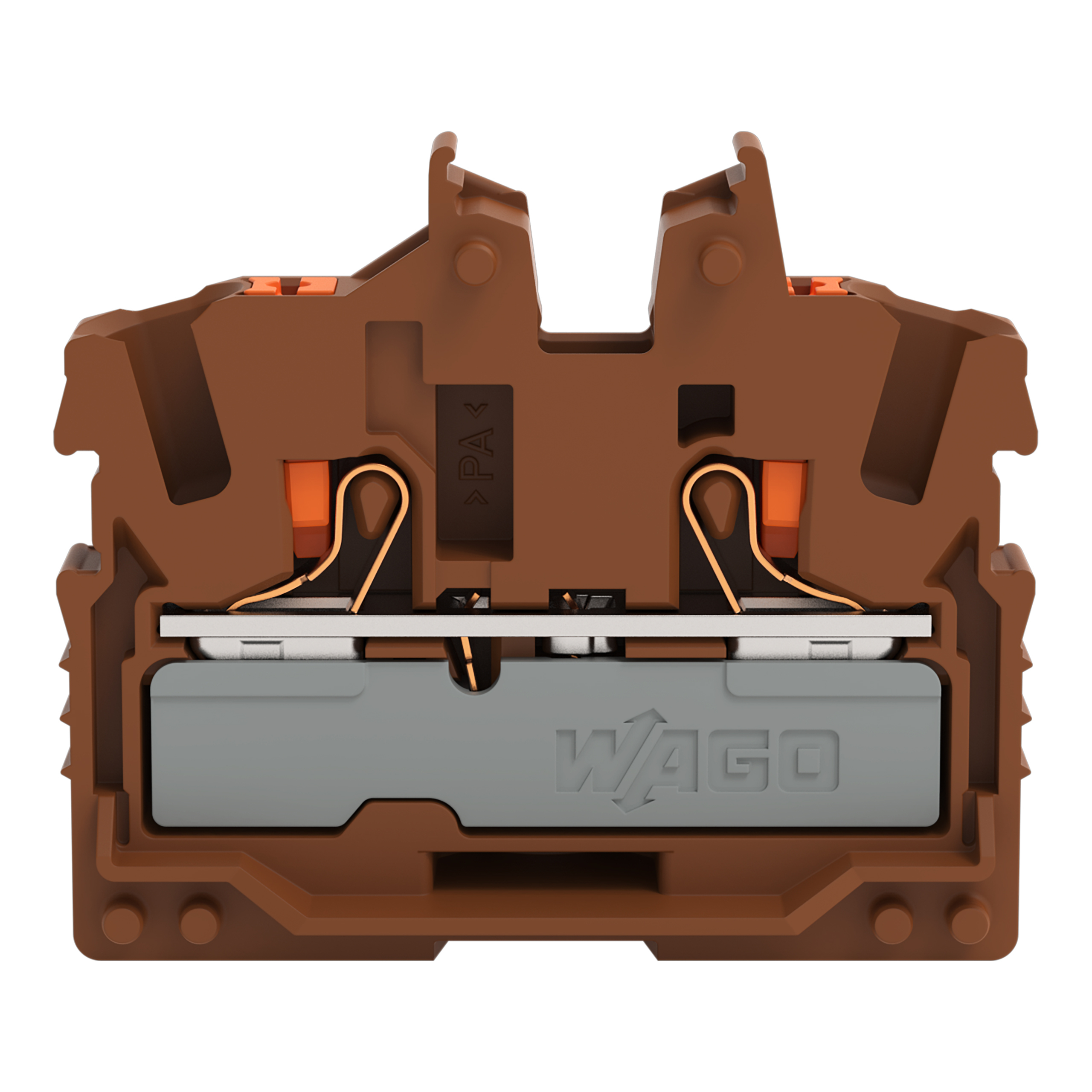 złączka przelotowa Mini 2-przewodowa; z przyciskami; 2,5 mm²; złączka końcowa z uchwytem montażowym; opis z boku i na środku; z otworem pomiarowym; Push-in CAGE CLAMP®; 2,50 mm²; brązowy