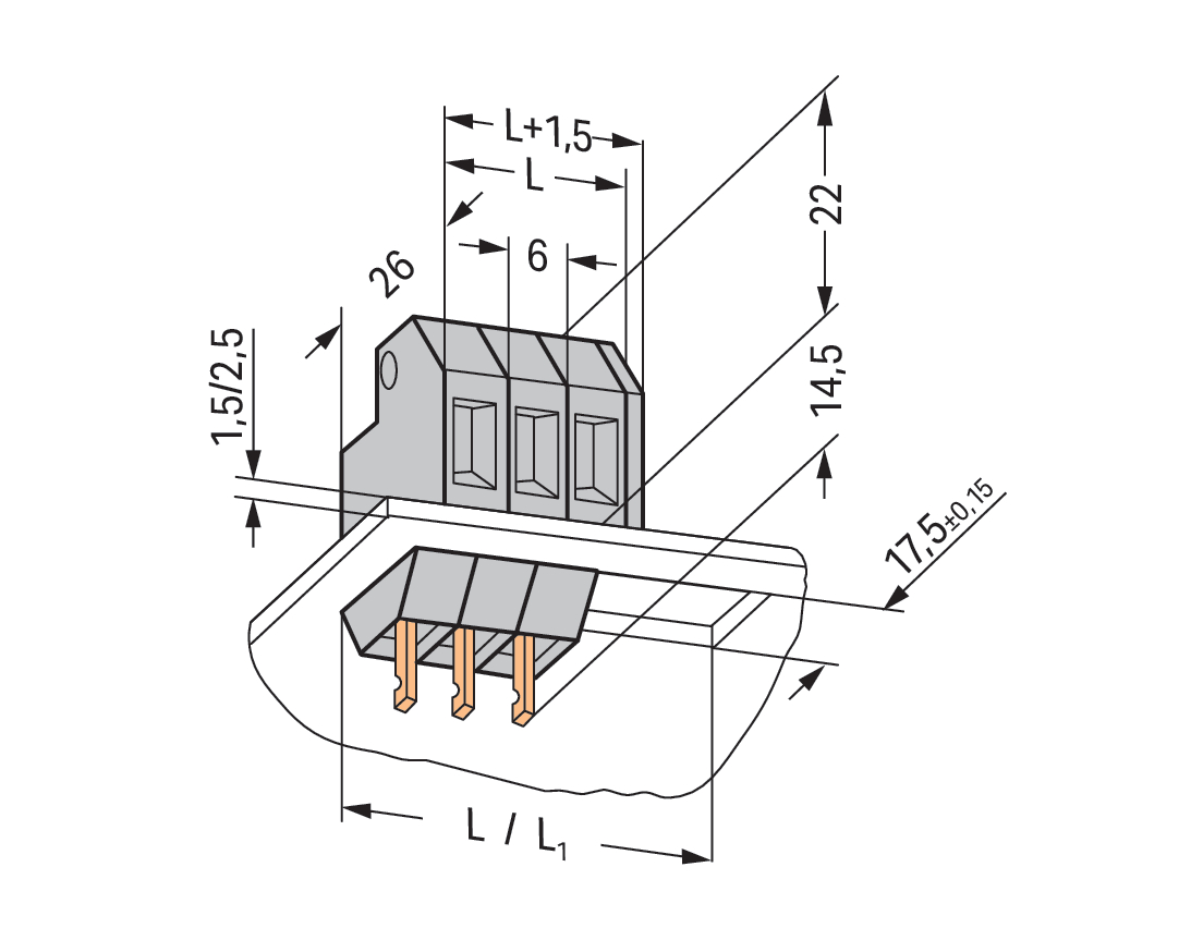złącze przepustowe; przyłącze przewod./lutow. i konektor.; grubość blachy 2,5 mm; 4 mm²; raster 6 mm; 1-bieg.; CAGE CLAMP®; 4,00 mm²; szary