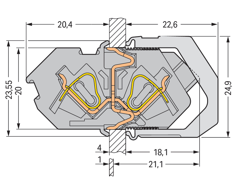 złącze przepustowe; połączenie przewód/przewód; grubość blachy 1 … 4 mm; 4 mm²; raster 7 mm; 2-bieg.; CAGE CLAMP®; 4,00 mm²; szary